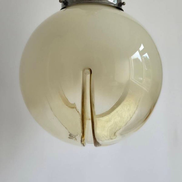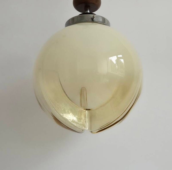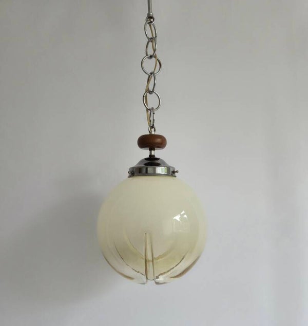 Deze vintage hanglamp van Murano glas is in de jaren 60/70 gemaakt in Italië door A.V. Mazzega. De glazen globe heeft aan de onderkant inkepingen in het glas. Het glas is deels gekleurd. Zowel de inkepingen als de kleur van het glas geven een prachtig lichteffect als de lamp brandt. De bol heeft een verchroomd metalen armatuur met houtaccenten.