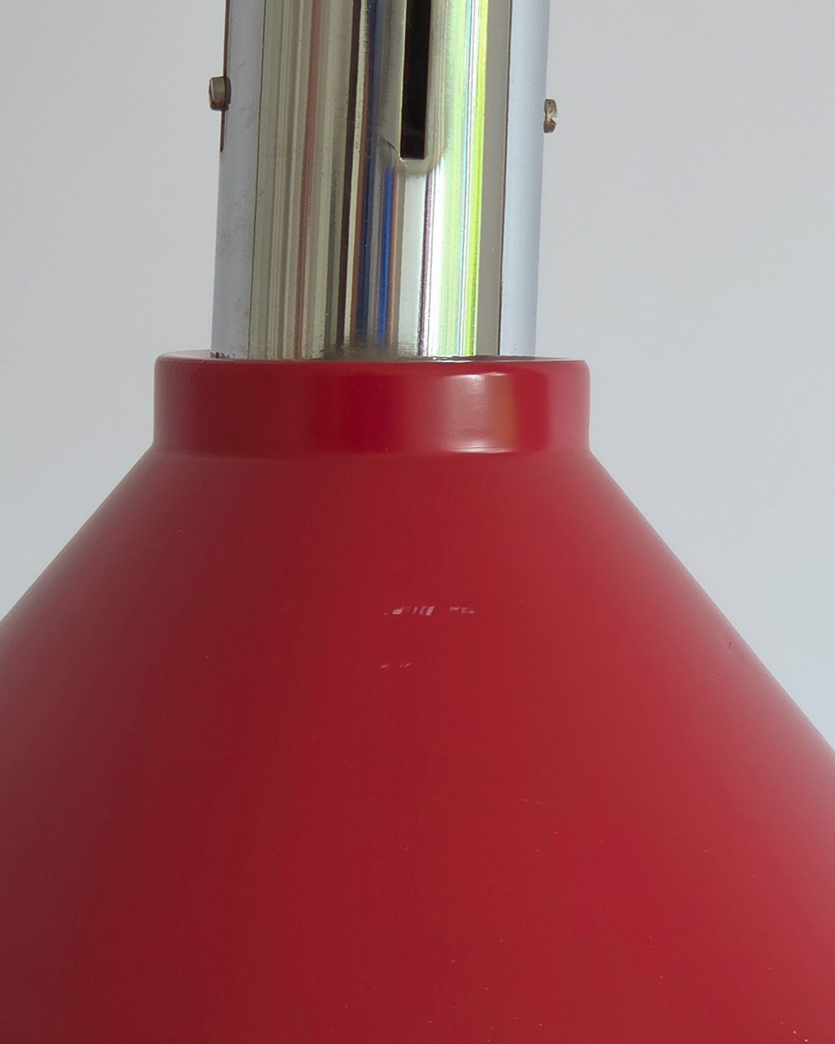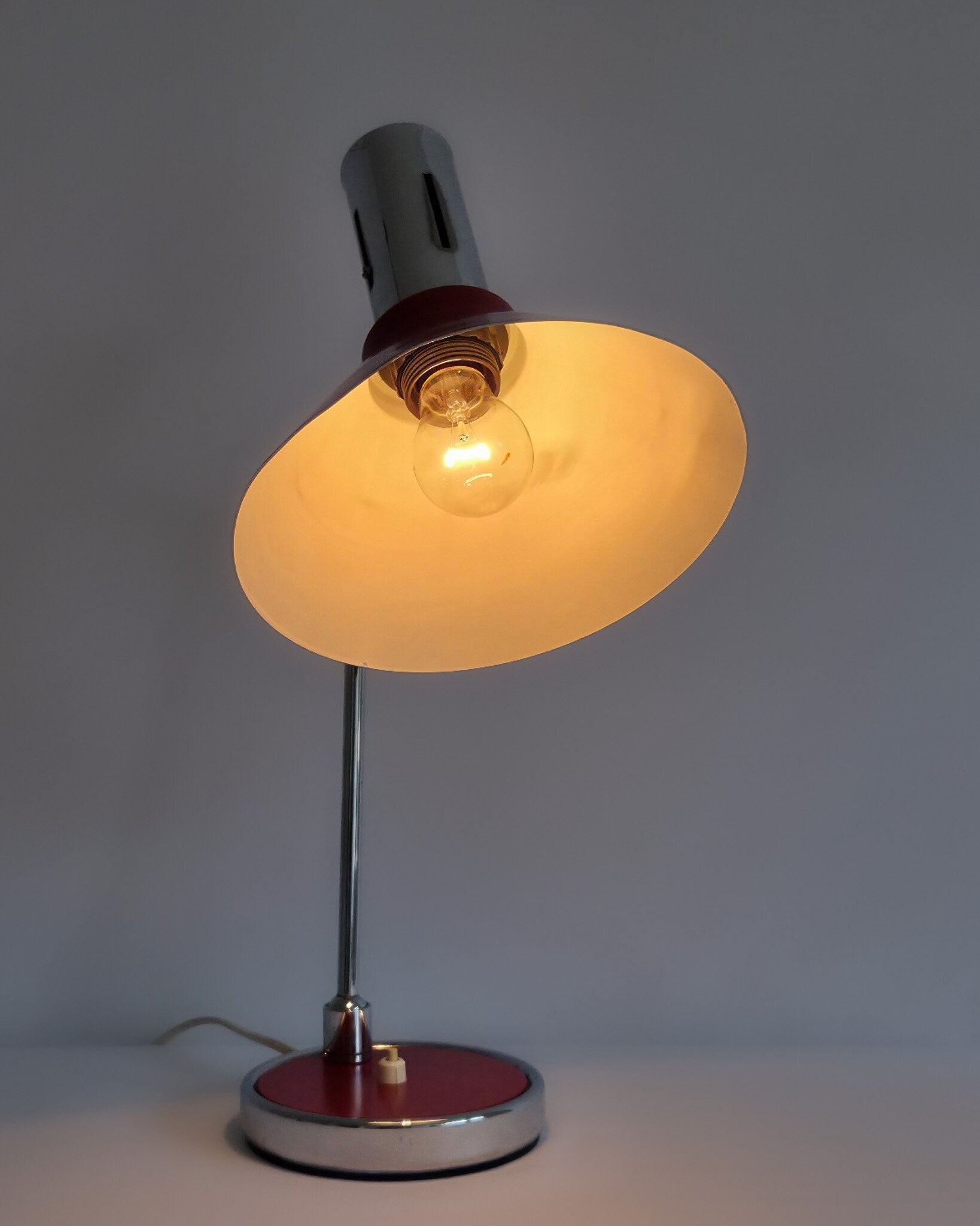 De bureaulamp heeft enkele gebruikssporen op de kap (deukje/krasjes) en op de voet. De kap is licht gebogen en het chroom is hier en daar aangetast. Desondanks is deze lamp nog in mooie staat gezien zijn leeftijd!