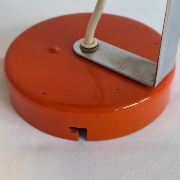 Een echte Space Age tafellamp uit de jaren 70! Dit Eyeball tafellampje of bureaulamp heeft een oranje kunststof kap met een crèmekleurige binnenzijde, een oranje metalen voet en een metalen arm. De arm en de bol kunnen gedraaid worden. Het lampje heeft een lichtschakelaar aan het snoer.