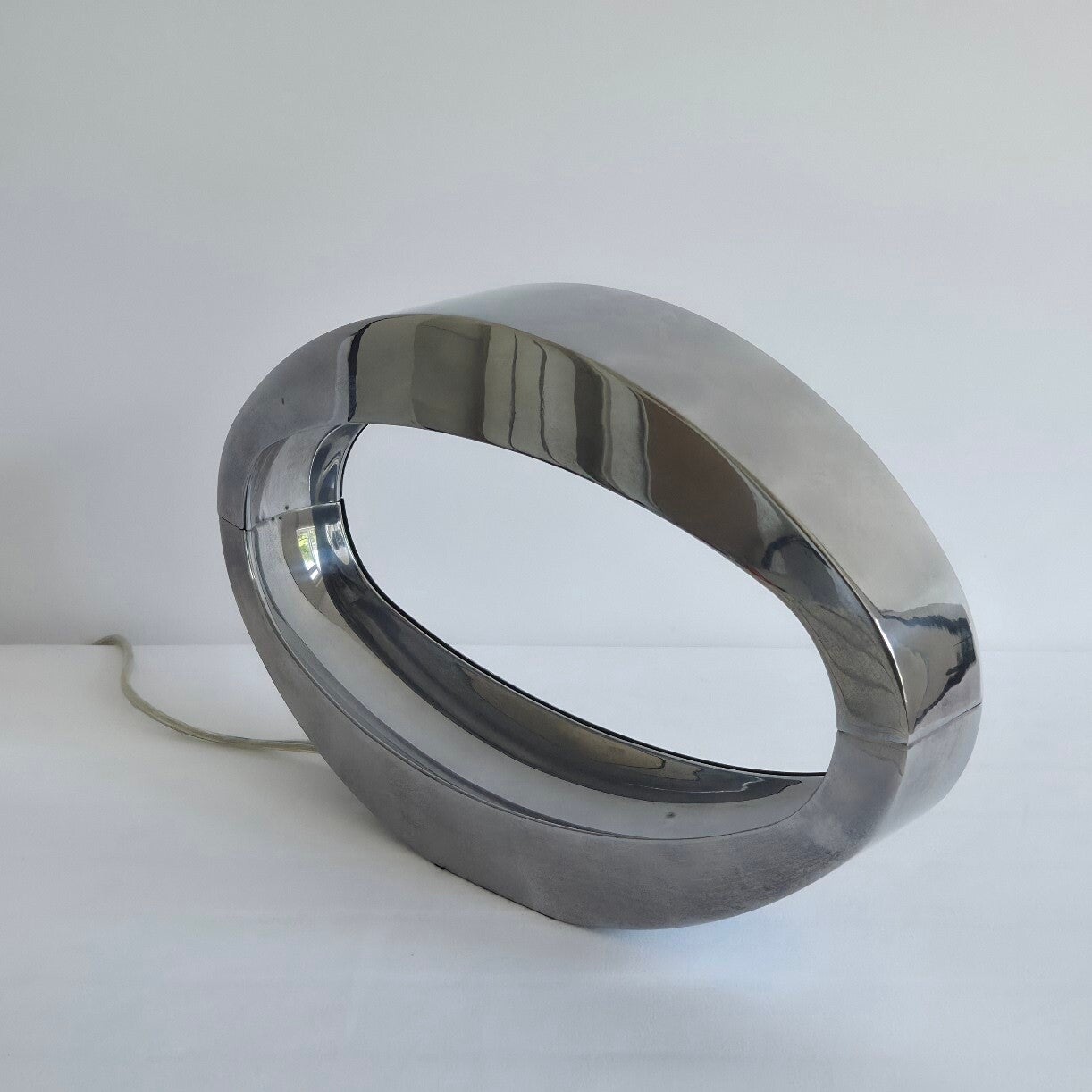 Deze vintage tafellamp uit de jaren 80/90 heeft een mooie ovale vorm. De lamp is geproduceerd door Massive, België. Dit model is bekend als ‘Berio’. De zilverkleurige lamp is van aluminium/metaal en heeft de vorm van een ellips. Het licht schijnt vanaf de bovenzijde naar beneden en geeft een mooi diffuus licht. Lichtschakelaar aan het snoer.