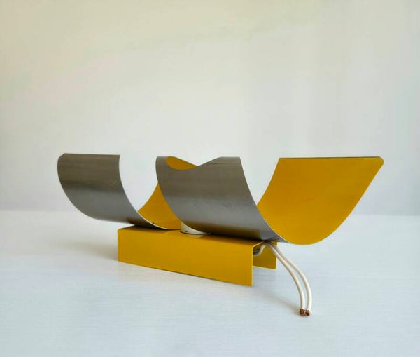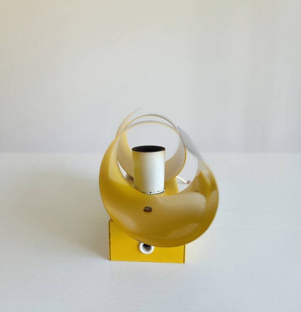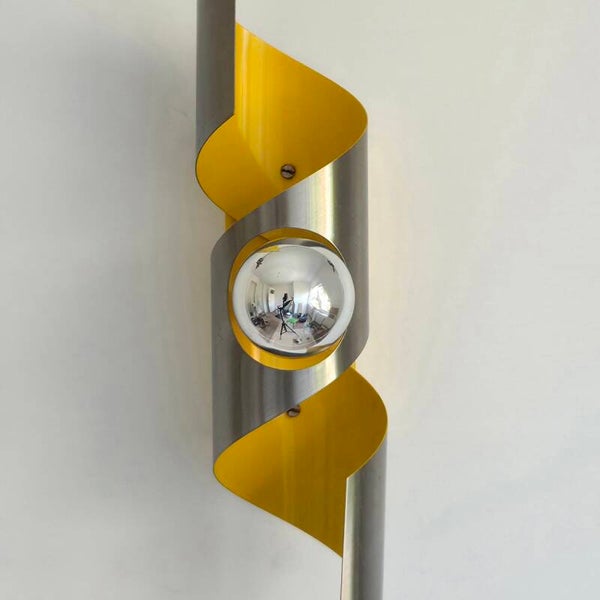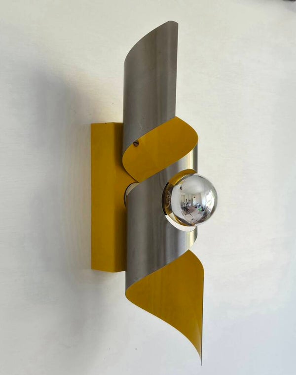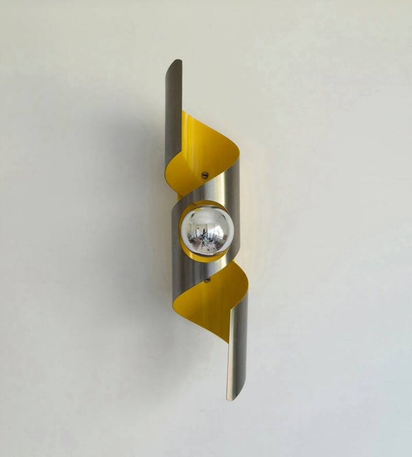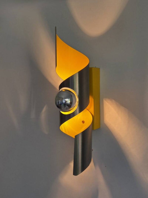 Geweldige Space Age wandlamp of ook wel wokkellamp genoemd. De lamp is geproduceerd door Polam, een Poolse verlichtingsfabrikant, oorspronkelijk opgericht door Philips. Deze vintage lamp is van metaal en heeft een verchroomde buitenkant met een gele binnenkant en gele wandbevestiging. Door een kopspiegellamp te gebruiken, ontstaat er een mooi lichteffect. Een prachtige Space Age lamp voor aan de wand!