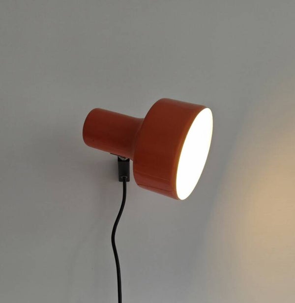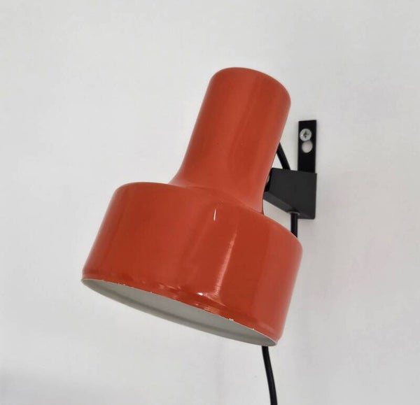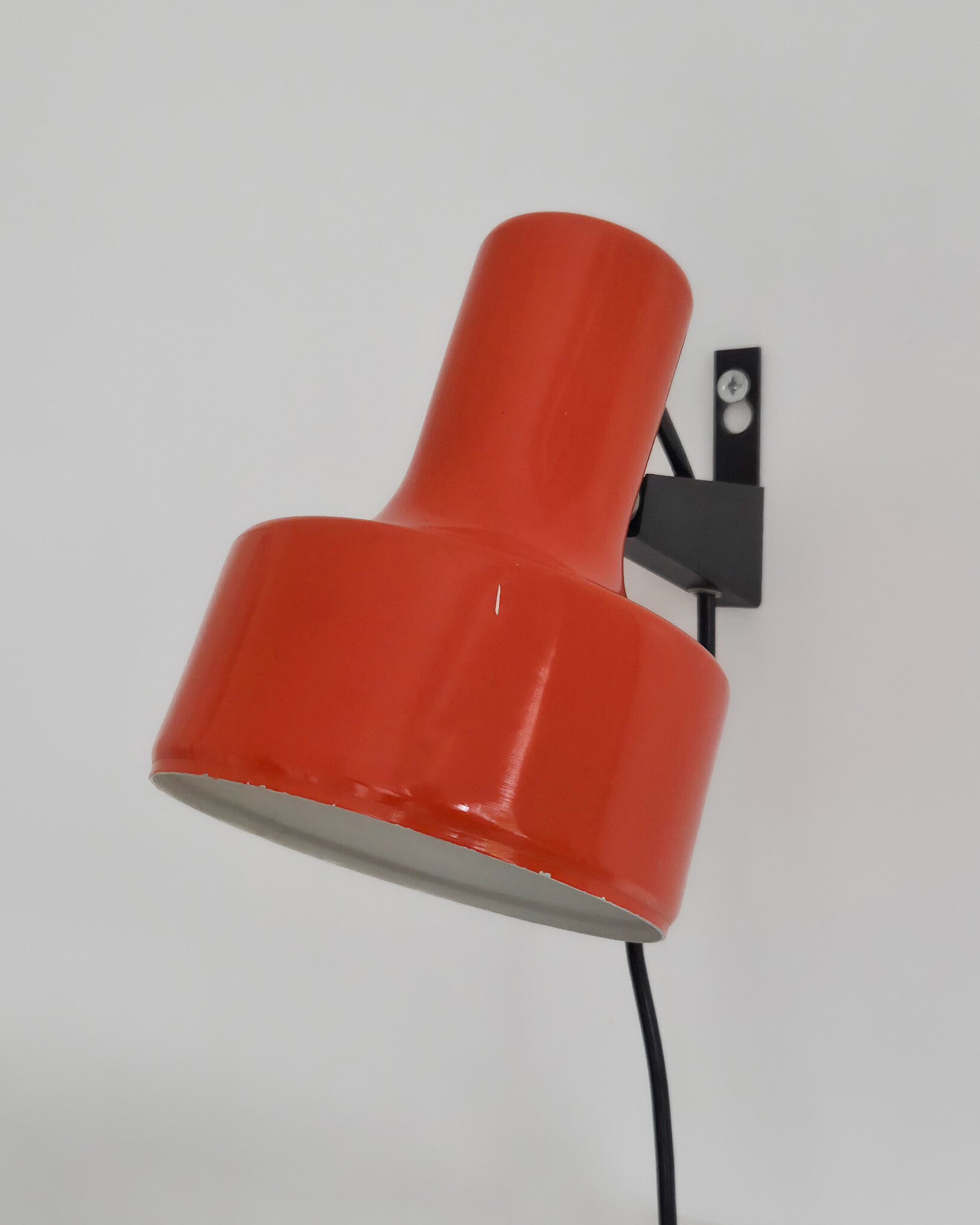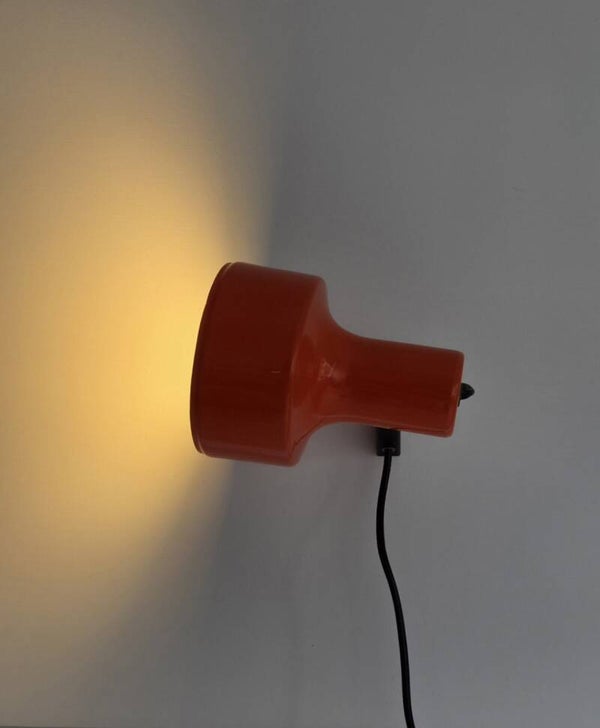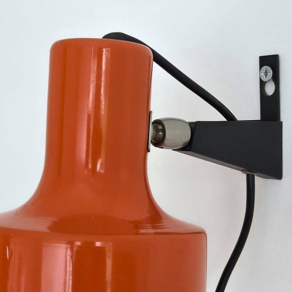 Deze oranje vintage wandlamp/wandspot is geproduceerd door Anvia Almelo in de jaren 60. Een opvallend wandlampje door zijn oranje kleur. De lamp is volledig van metaal, heeft een oranje kap met witte binnenzijde en een zwart armatuur waarmee de lamp aan de wand kan worden bevestigd. De kap kan door middel van het kogelgewricht in verschillende richtingen gedraaid worden. Lichtschakelaar aan het snoer.