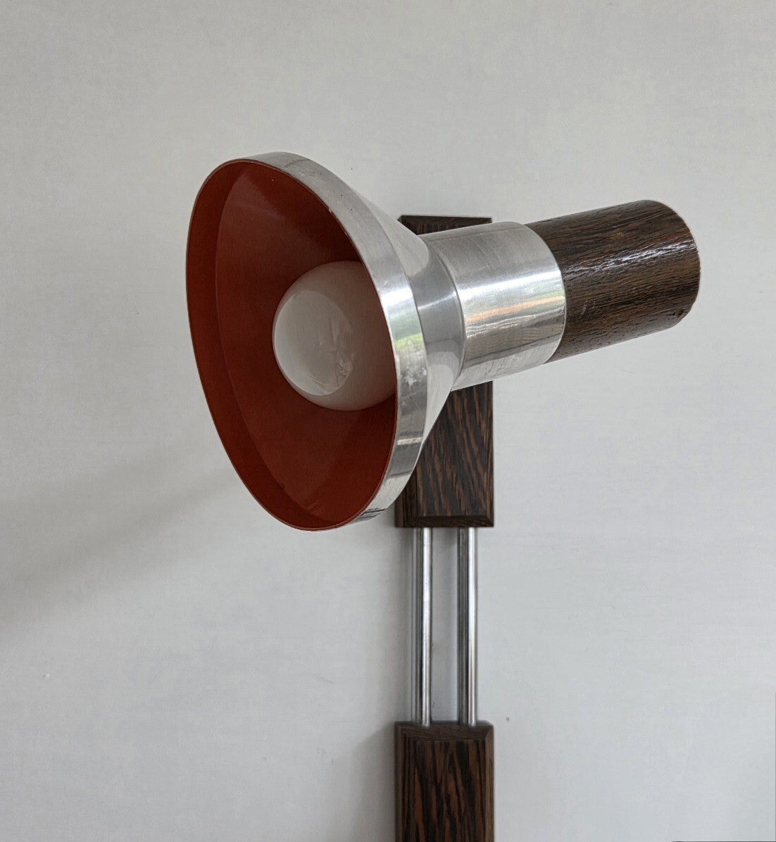 Deze mooie wandlamp met dubbele spot uit de jaren 60 is een prachtige vintage lamp. De spots zijn van aluminium en hout en hebben een rood/oranje binnenzijde. Door de gekleurde binnenzijde ontstaat er een warme lichtreflectie. De houtaccenten geven de lamp een stijlvolle en duurzame uitstraling. De lamp zou geproduceerd kunnen zijn door Anvia Almelo of Lakro, maar is niet gemerkt. Lichtschakelaar aan het snoer. Door middel van een kogelscharnier zijn de spots zijn naar alle kanten draaibaar.