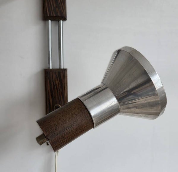 Deze mooie wandlamp met dubbele spot uit de jaren 60 is een prachtige vintage lamp. De spots zijn van aluminium en hout en hebben een rood/oranje binnenzijde. Door de gekleurde binnenzijde ontstaat er een warme lichtreflectie. De houtaccenten geven de lamp een stijlvolle en duurzame uitstraling. De lamp zou geproduceerd kunnen zijn door Anvia Almelo of Lakro, maar is niet gemerkt. Lichtschakelaar aan het snoer. Door middel van een kogelscharnier zijn de spots zijn naar alle kanten draaibaar.