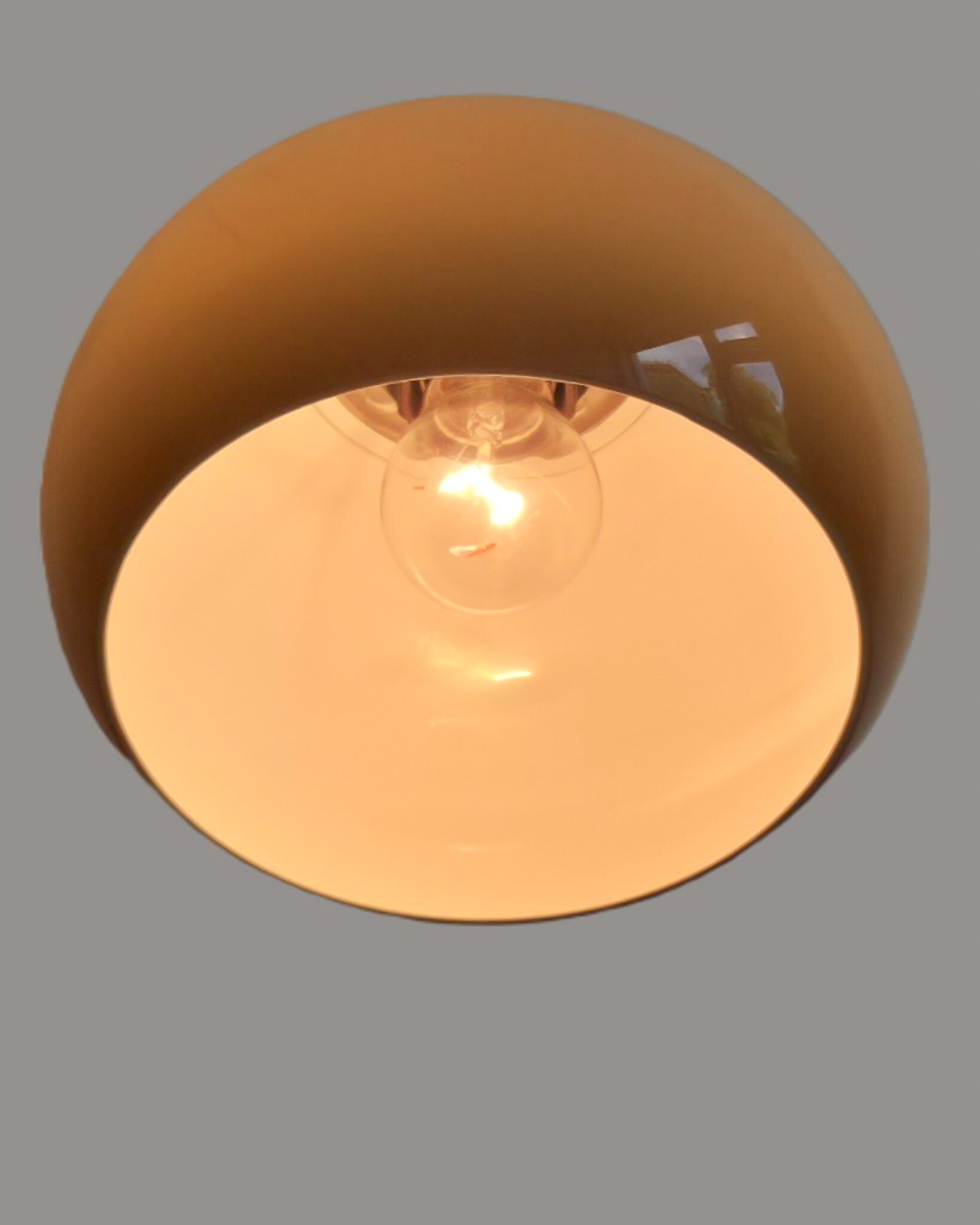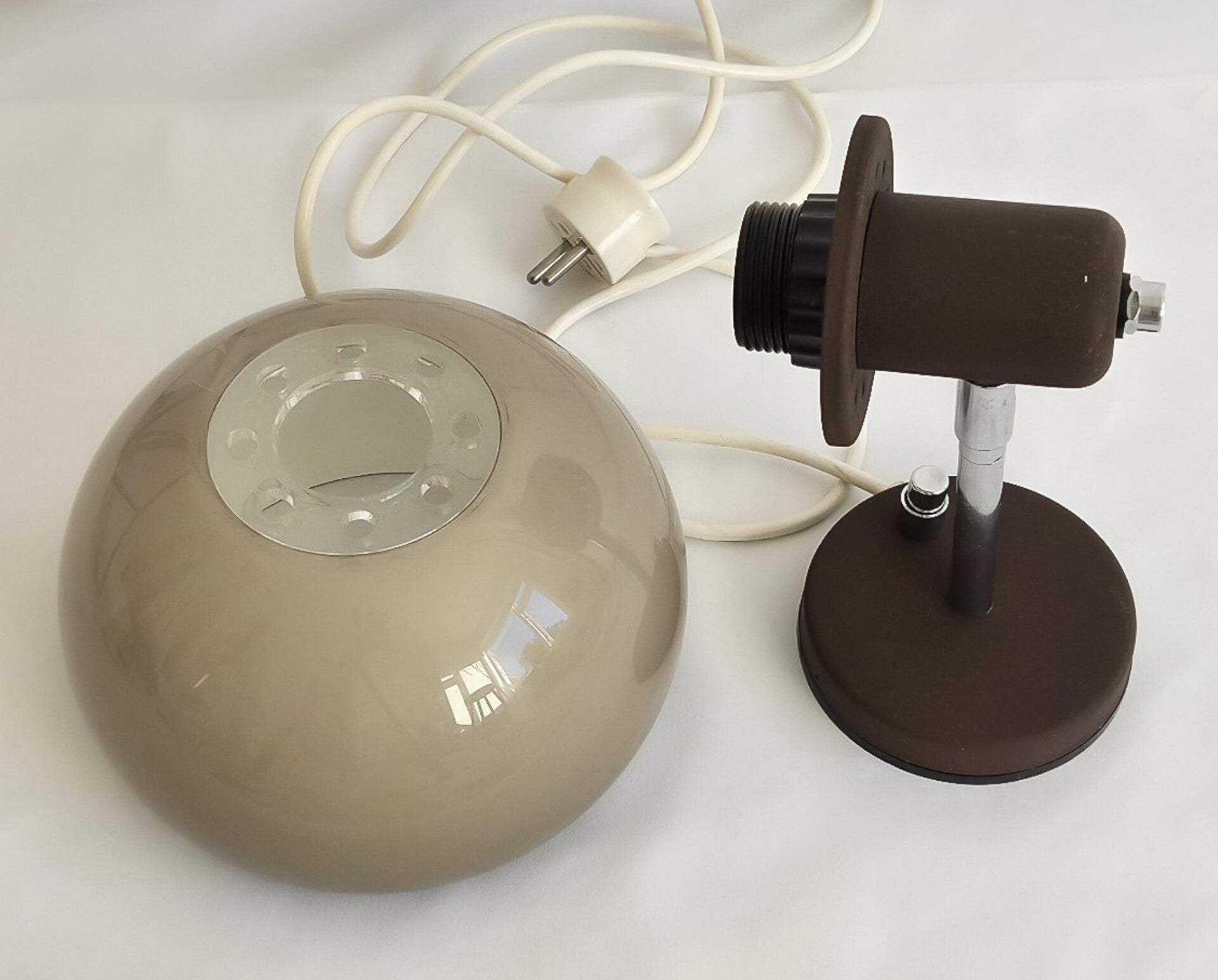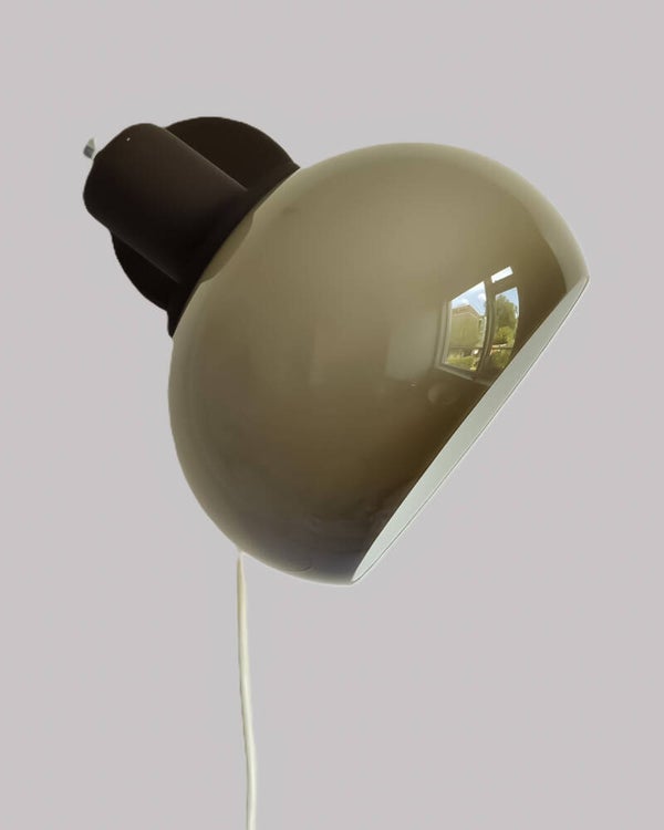 Deze sfeervolle mushroom wandlamp is gemaakt in de jaren 70. De lamp heeft de kenmerkende beige mushroom kap en kan worden toegeschreven aan Herda Verlichting. De lampenkap is gemaakt van plexiglas wat mede door de kleur een warm licht geeft. De ronde wandbevestiging is van metaal (bruin) en heeft een chroomkleurige lichtknop. De kap kan gedraaid worden.