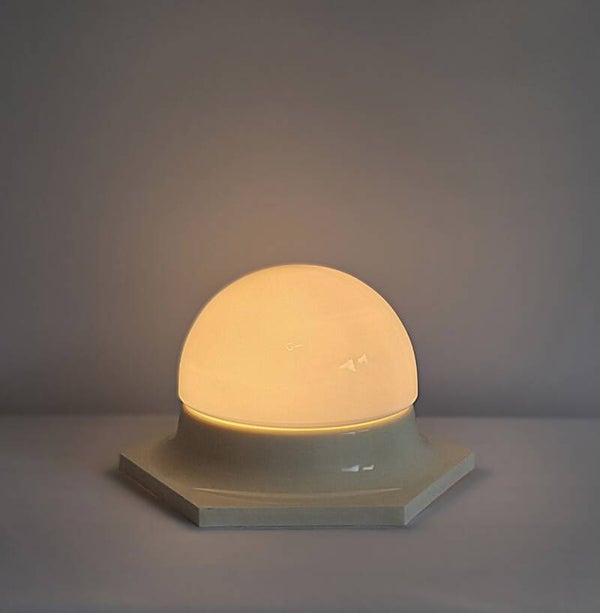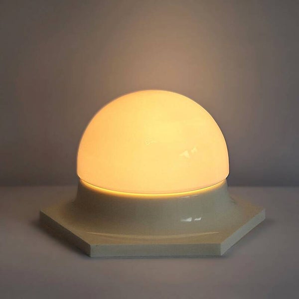 De lamp is in goede staat. Glazen kap heeft geen beschadigingen. Mogelijk is het kunststof iets vergeeld in de loop der jaren.