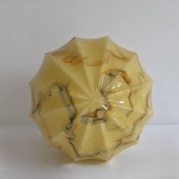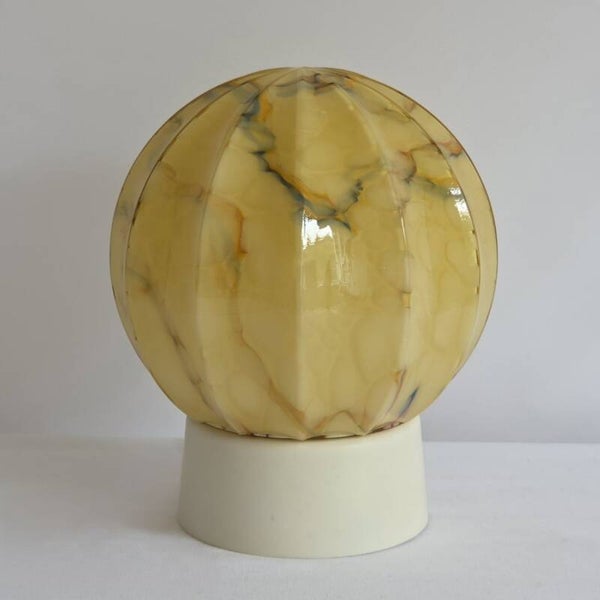 Deze prachtige Art Deco plafondlamp met opaline glazen kap is in de jaren 30 gemaakt door de firma Thabur in Den Haag. De glazen kap is geribbeld en heeft een diepwarme okergele kleur met een gemarmerd patroon. De lamp heeft een bakelieten plafondkap van het merk NIKO.