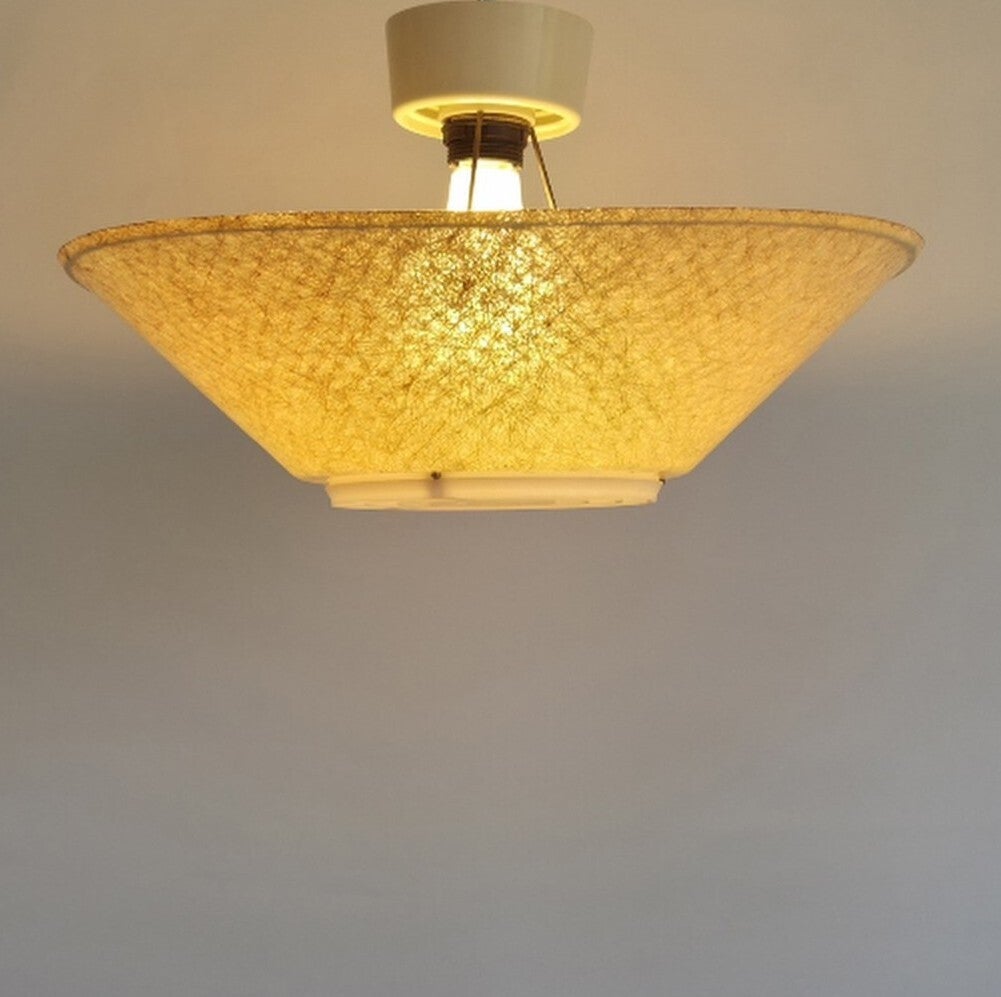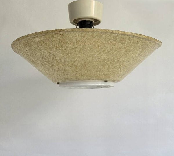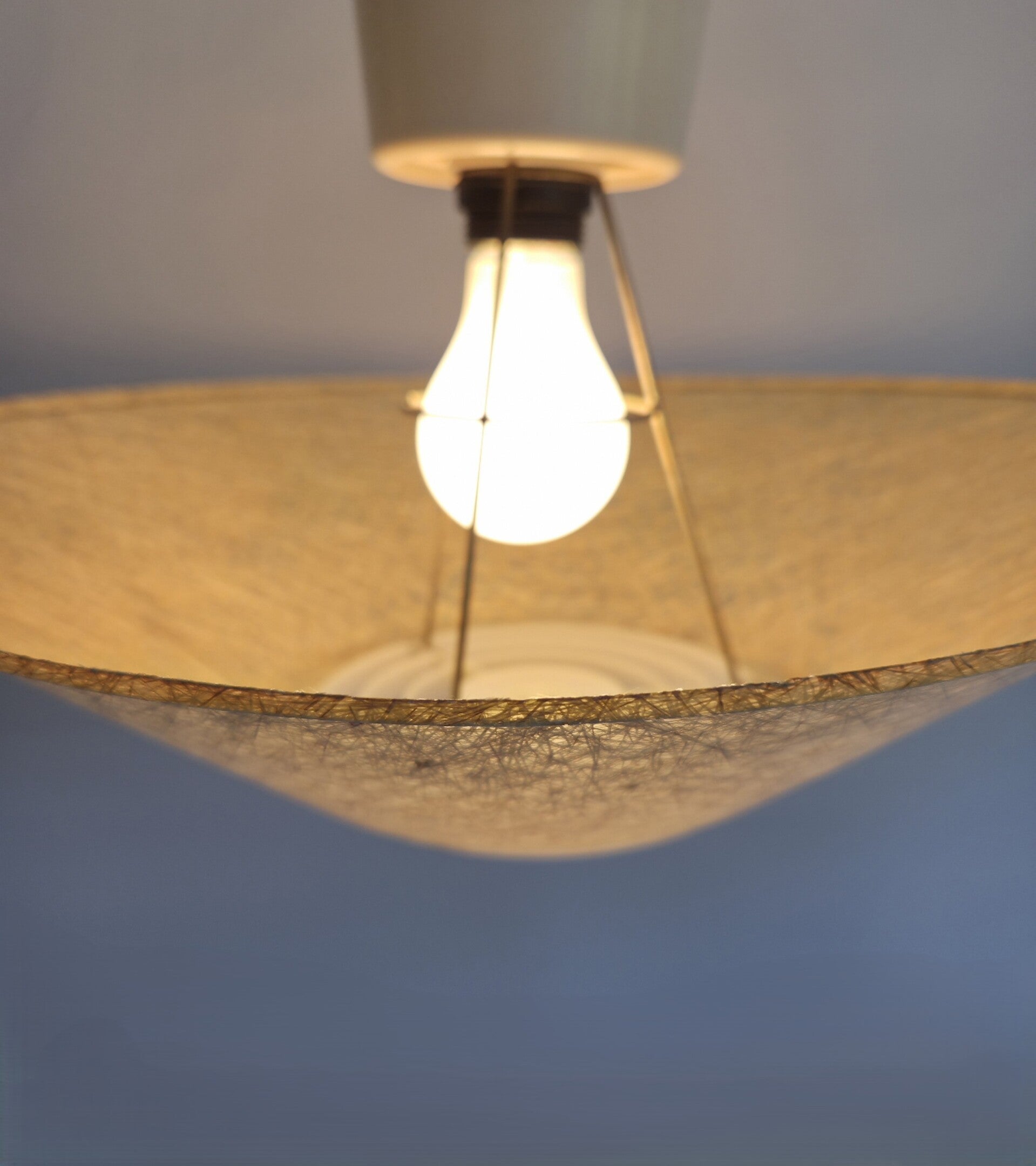 Deze jaren 50 plafondlamp is ontworpen door Louis Kalff voor Philips. De kap is gemaakt van dun glasvezel wat een natuurlijke uitstraling heeft. Het licht schijnt door de kap heen en geeft een warme sfeer. Aan de bakelieten plafondkap (niet origineel) zijn drie metalen stangetjes bevestigd die samen komen in een kunststof ring waar de lampenkap in hangt. De kunststof ring werkt als een diffuser en helpt het licht te verspreiden.