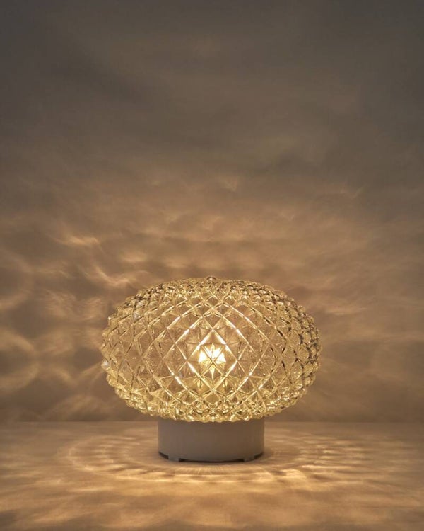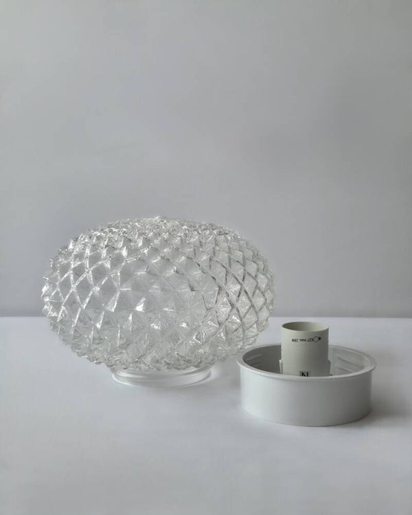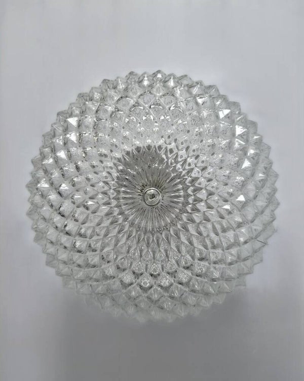 Deze klassieke plafondlamp uit de jaren 70 heeft een kap van transparant glas met ananas reliëf. Dit geeft een bijzonder mooi lichteffect als de lamp brandt. De lamp is vermoedelijk geproduceerd door Massive. De glazen kap is bevestigd aan een kunststof plafondkap.