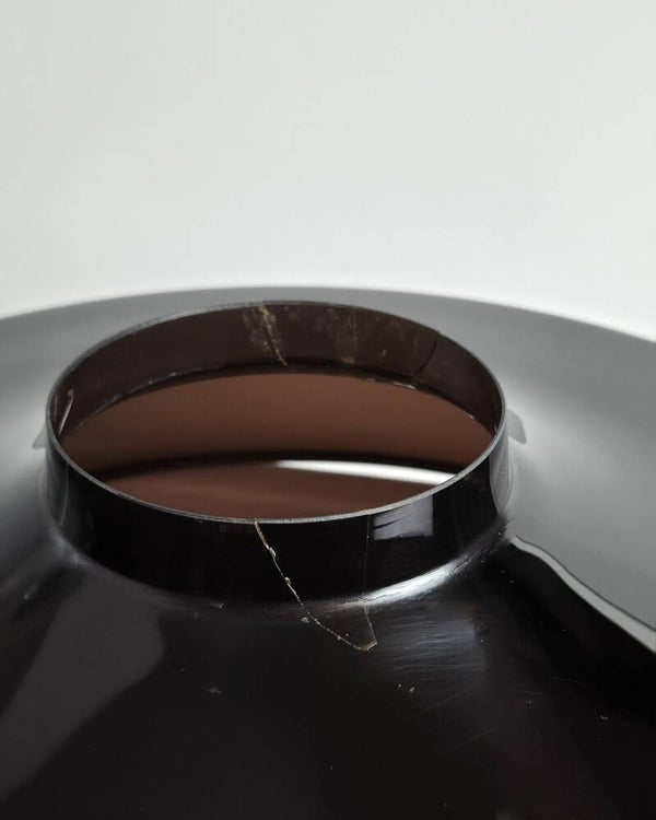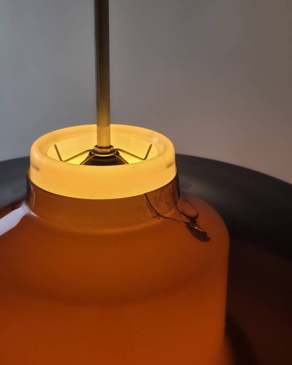 De acrylglazen kap heeft aan de bovenkant twee beschadigingen die gerestaureerd zijn. Bekijk de foto's goed en gebruik het vergrootglas om verder in te zoomen. De beschadigingen zijn nauwelijks zichtbaar als de lamp hangt. De rest van de lamp verkeert in goede staat met normale gebruikssporen.