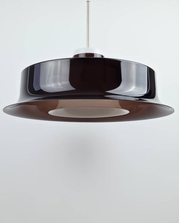 Geweldige vintage hanglamp met grote kap en witte binnenkap, vermoedelijk geproduceerd in de jaren 60/70. De donker getinte kap van acrylglas, ook bekend als plexiglas, filtert het licht op een zachte manier, waardoor er een warme sfeer ontstaat. De witte binnenkap licht op een bijzondere manier op als de lamp aan is.