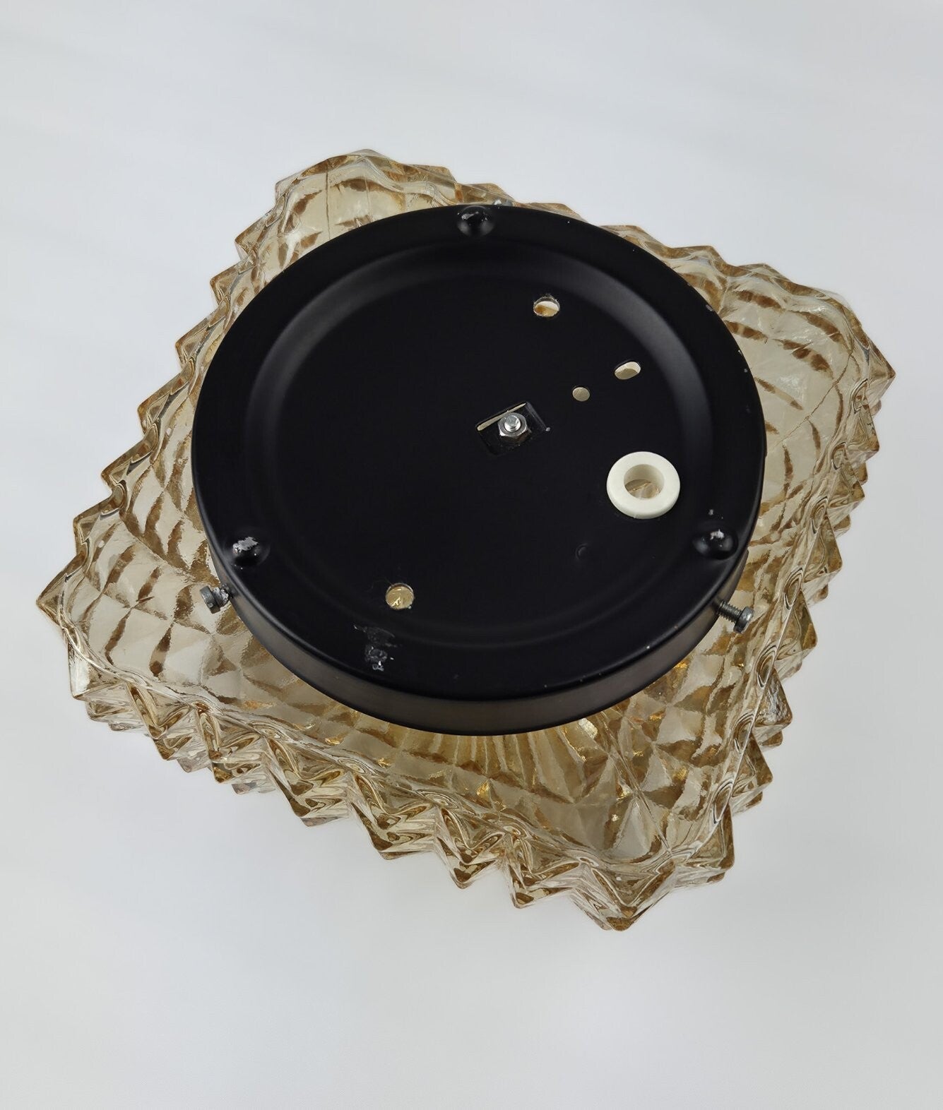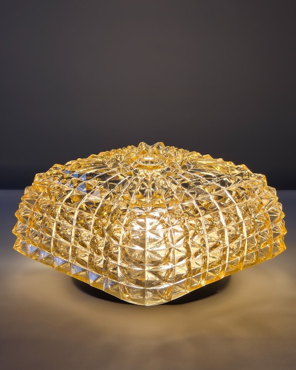 Deze vintage plafondlamp is geproduceerd in de jaren 60/70, vermoedelijk door Massive (België). De kap is gemaakt van amberkleurig persglas in diamantpatroon. Dit zorgt voor een prachtige fonkeling als de lamp brandt. De kap is bevestigd op een metalen armatuur en heeft één porseleinen fitting.