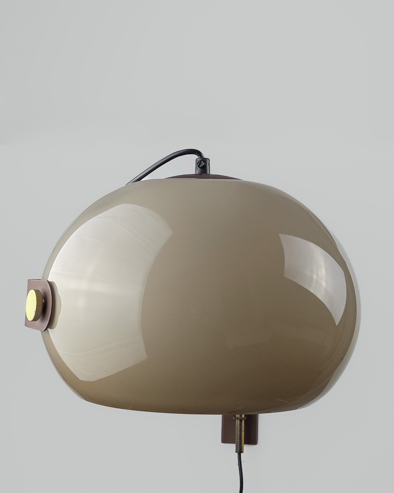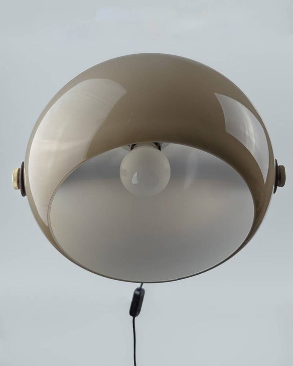Originele vintage wandlamp van Dijkstra Lampen uit de jaren 70. Dijkstra heeft verschillende lampen geproduceerd met de bekende mushroom lampenkappen van plexiglas. Deze lamp heeft een mushroomkap in de herkenbare beige kleur. Het armatuur is vervaardigd uit messing, deels afgewerkt in bruin met een goudkleurige arm. Dankzij de meerdere draaipunten is de lamp op verschillende manieren te verstellen. De lamp wordt geleverd met de originele wandbevestiging en een lichtschakelaar aan het snoer.