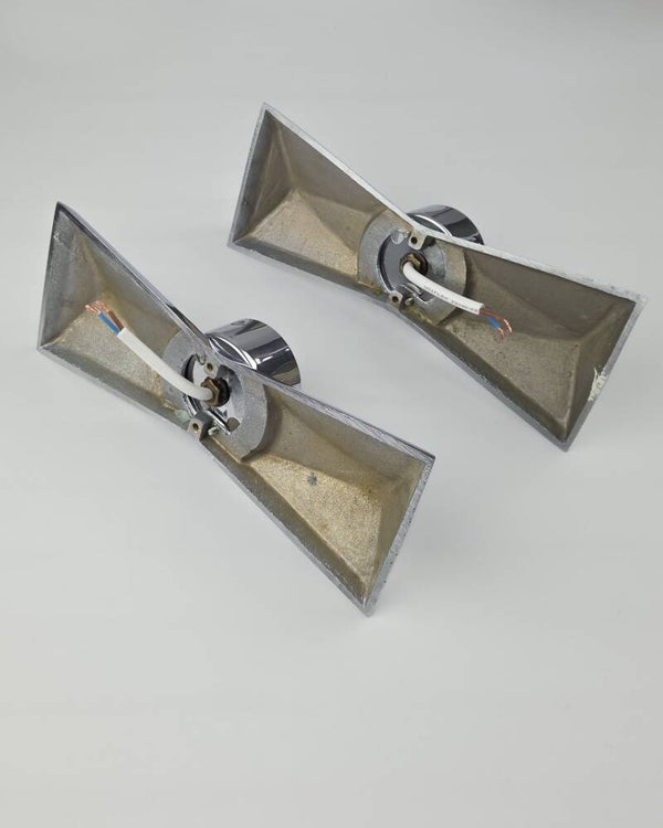 De vintage wandlampen zijn in goede staat. Het glas is gaaf. Het chroom heeft lichte gebruikssporen (krasjes en kleine plekjes).