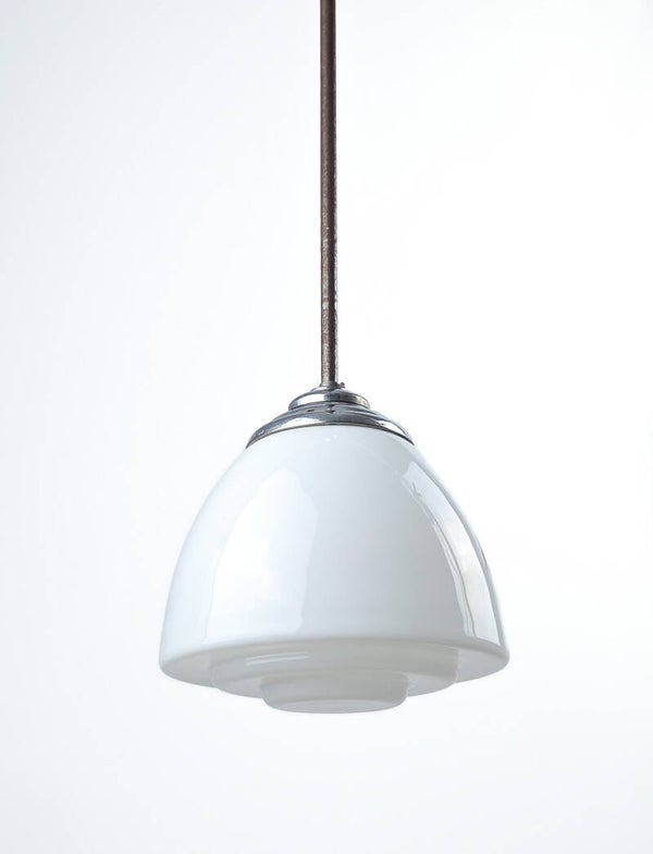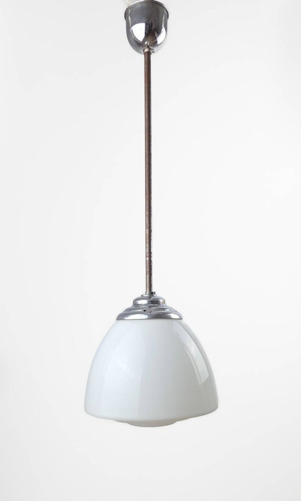 Mooie vintage Art Deco hanglamp in Gispen stijl. De lamp heeft een wit glazen kap die aan de onderkant getrapt is. De glazen kap hangt aan een messing pendel. De kaphouder en de ronde plafondkap zijn verchroomd.