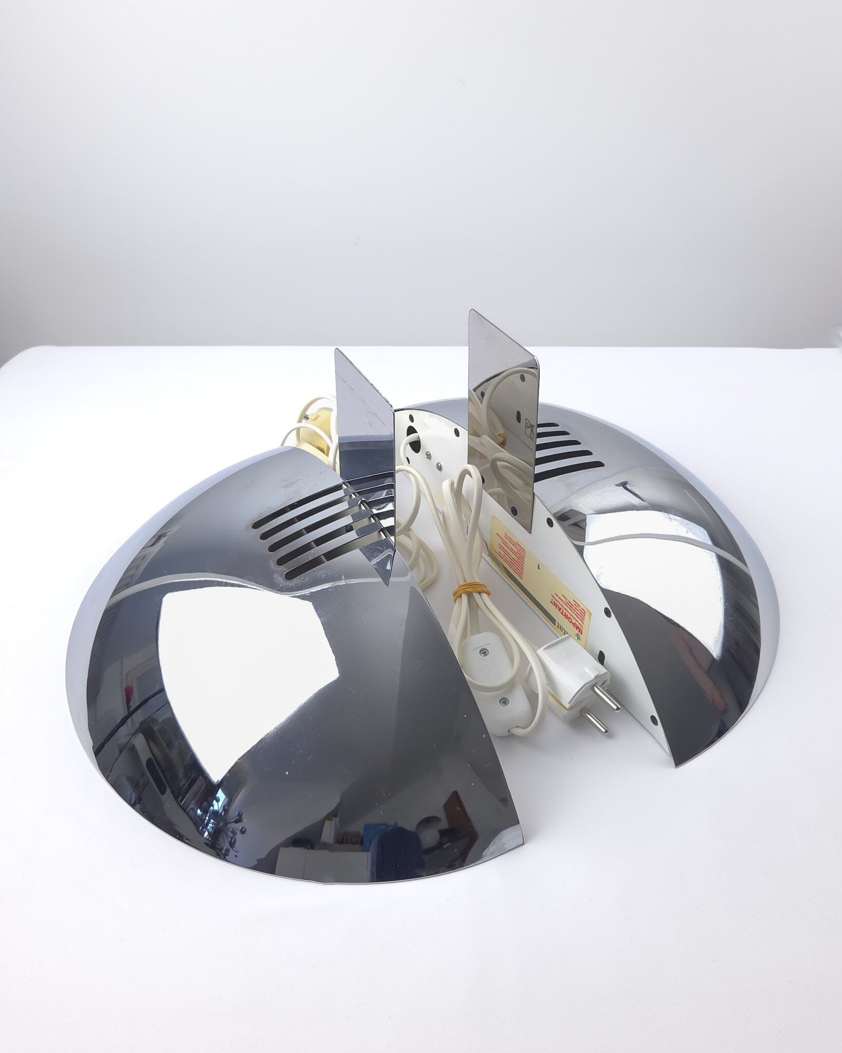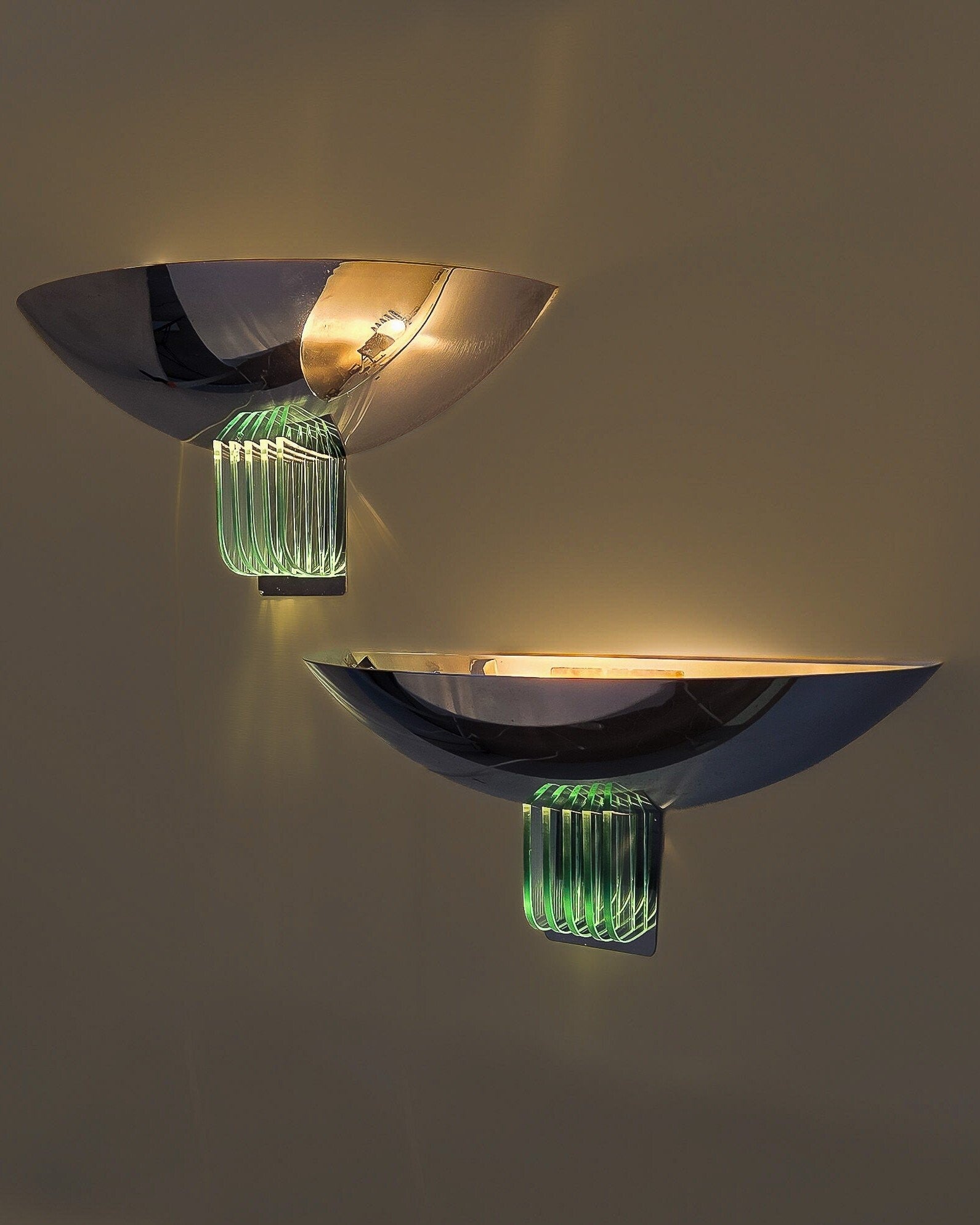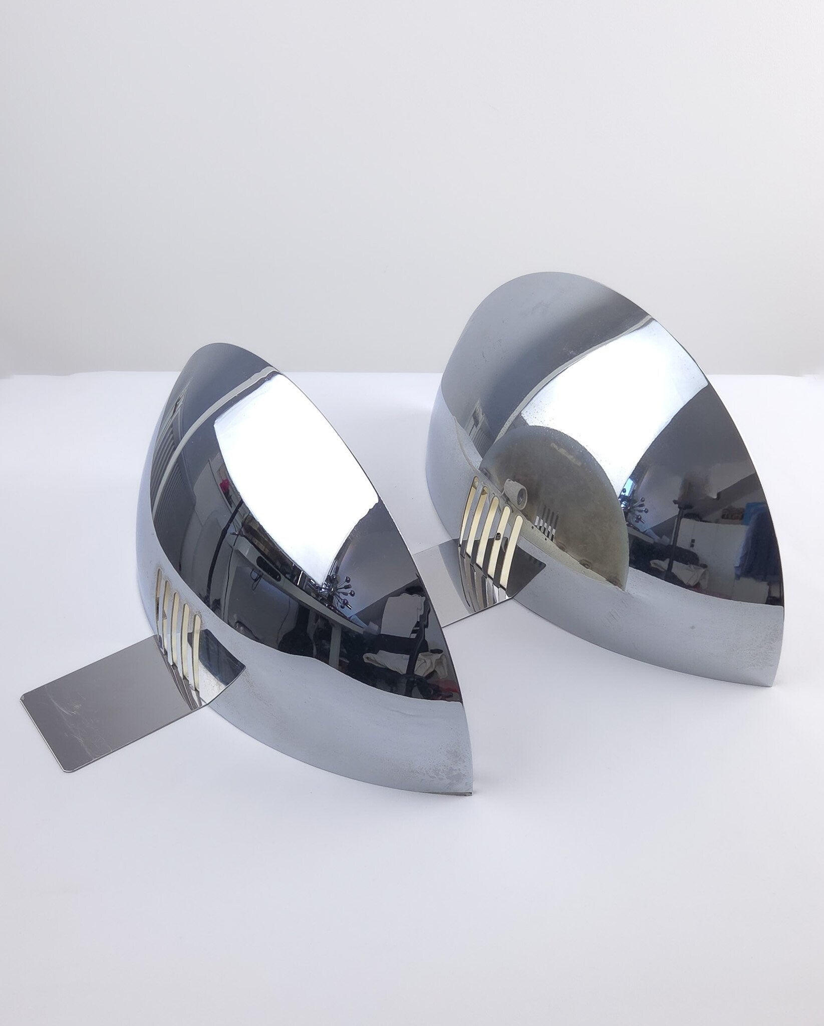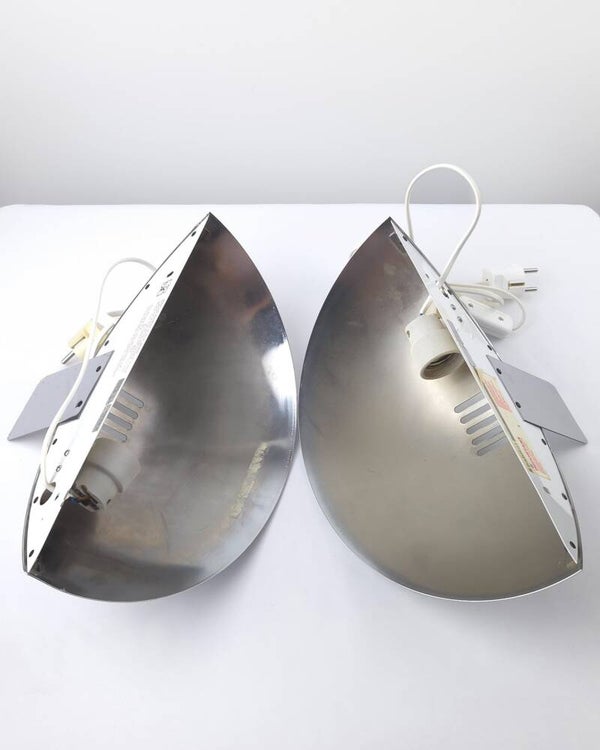 Deze unieke vintage wandlampen, zogenoemde 'uplighters', zijn geproduceerd door Lumess, Zwitserland in de jaren 70. De halfronde lampen zijn gemaakt van verchroomd metaal en glas. In het metaal zijn uitkepingen gemaakt waar 5 glasplaatjes inhangen. Het licht schijnt naar boven en naar beneden door de glasplaatjes heen. Dit geeft een futuristische sfeer passend bij de periode waarin de lampen gemaakt zijn. Aan de binnenzijde van de lamp is een porseleinen fitting bevestigd. Lichtschakelaar aan het snoer. De originele stickers zijn nog aanwezig.