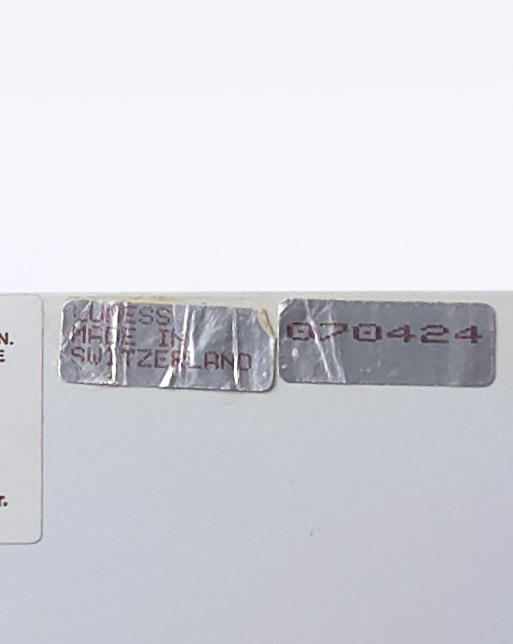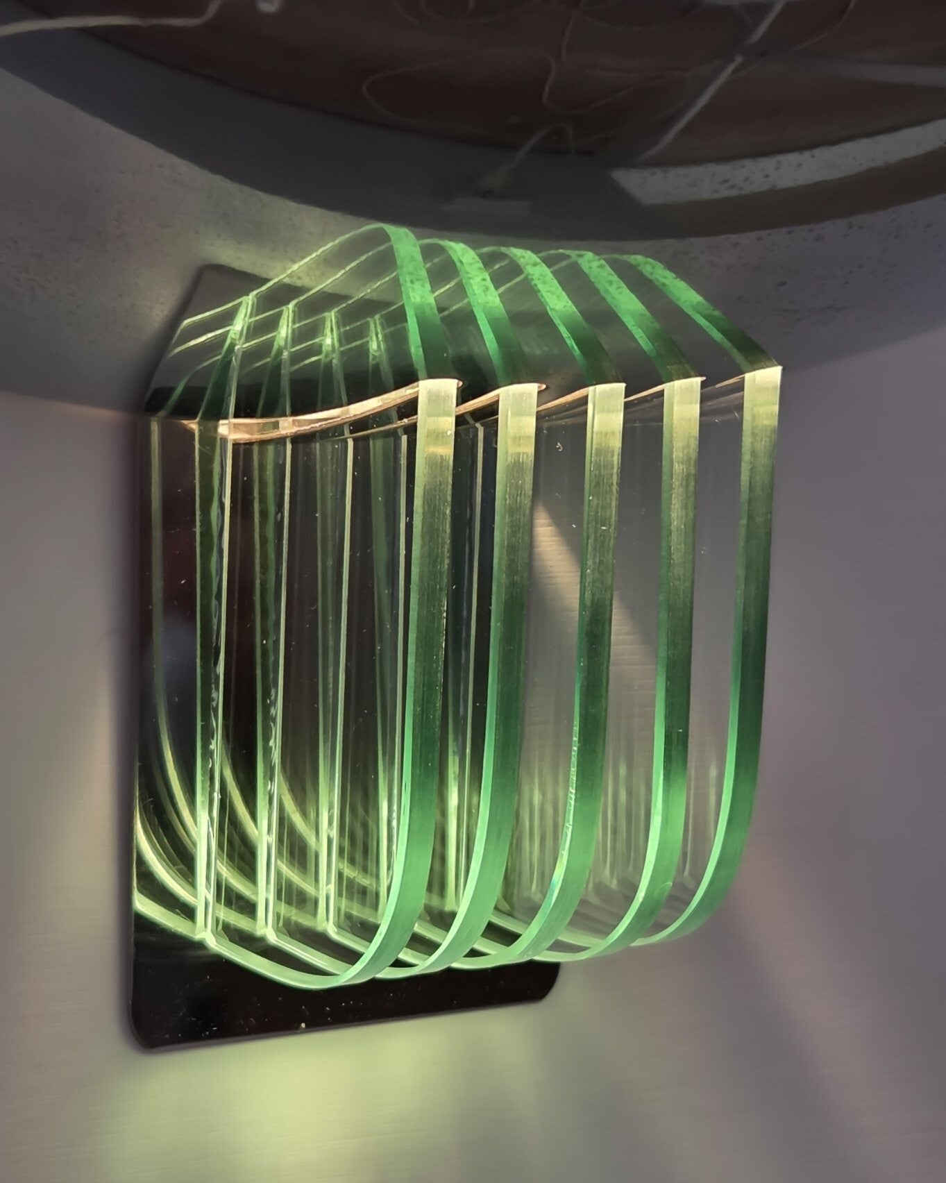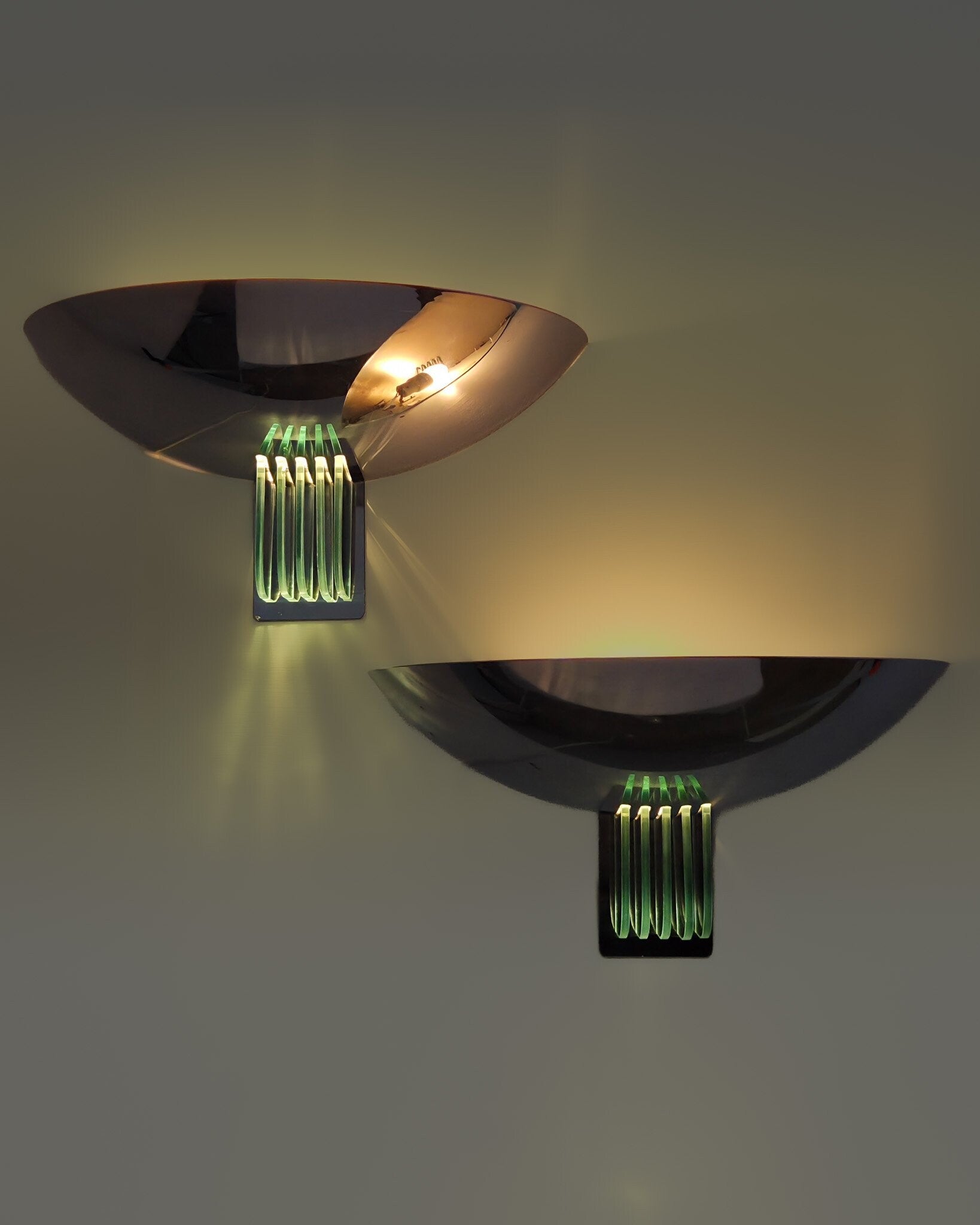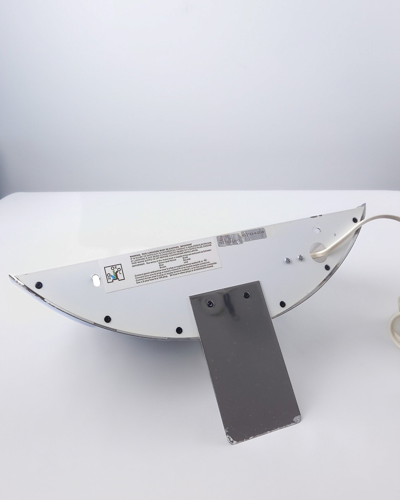Deze unieke vintage wandlampen, zogenoemde 'uplighters', zijn geproduceerd door Lumess, Zwitserland in de jaren 70. De halfronde lampen zijn gemaakt van verchroomd metaal en glas. In het metaal zijn uitkepingen gemaakt waar 5 glasplaatjes inhangen. Het licht schijnt naar boven en naar beneden door de glasplaatjes heen. Dit geeft een futuristische sfeer passend bij de periode waarin de lampen gemaakt zijn. Aan de binnenzijde van de lamp is een porseleinen fitting bevestigd. Lichtschakelaar aan het snoer. De originele stickers zijn nog aanwezig.