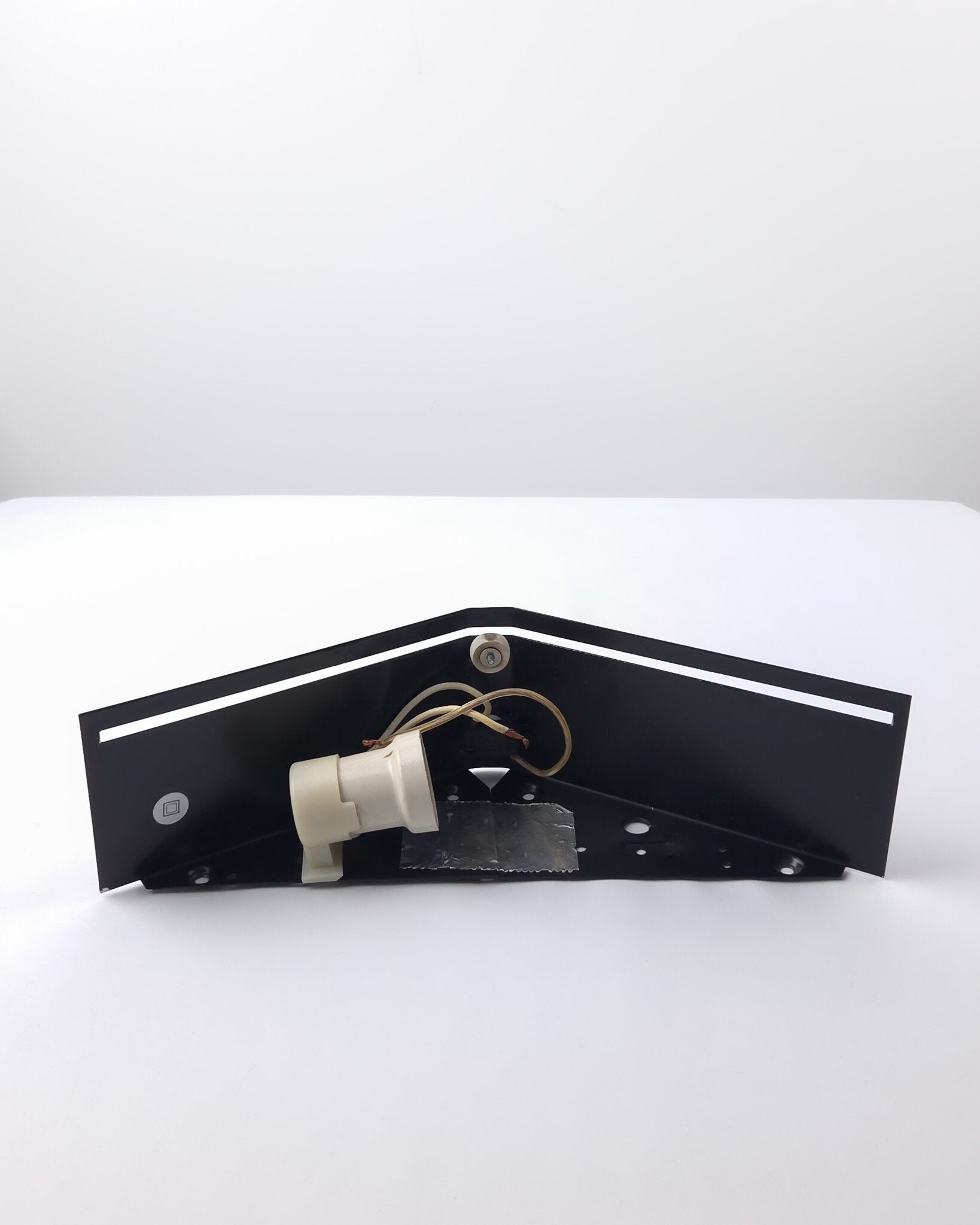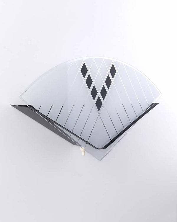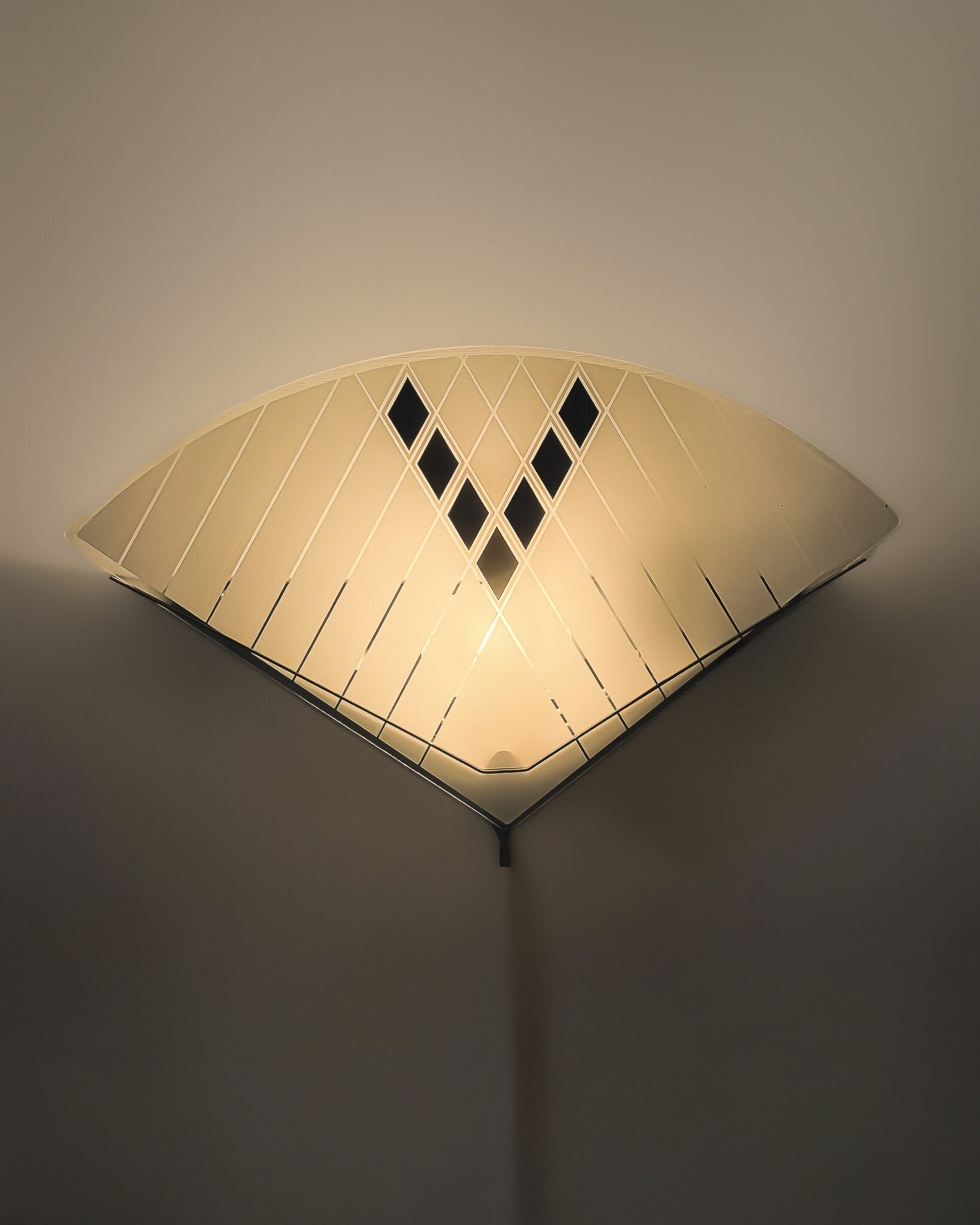 Vintage wandlamp van Massive uit de jaren 80. Deze stijlvolle lamp heeft een zwart metalen armatuur met een glazen plaat. Het glas is voorzien van een wit-zwart geometrisch patroon in Art Deco stijl. De glasplaat 'hangt' in een uitsparing in het armatuur. De lamp is voorzien van een lichtknopje op het armatuur.