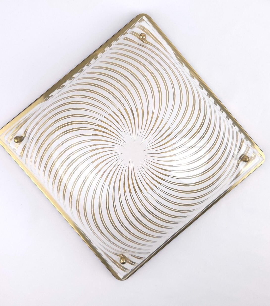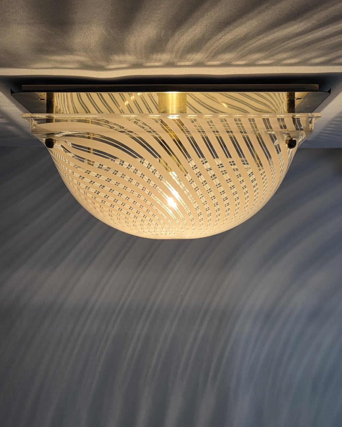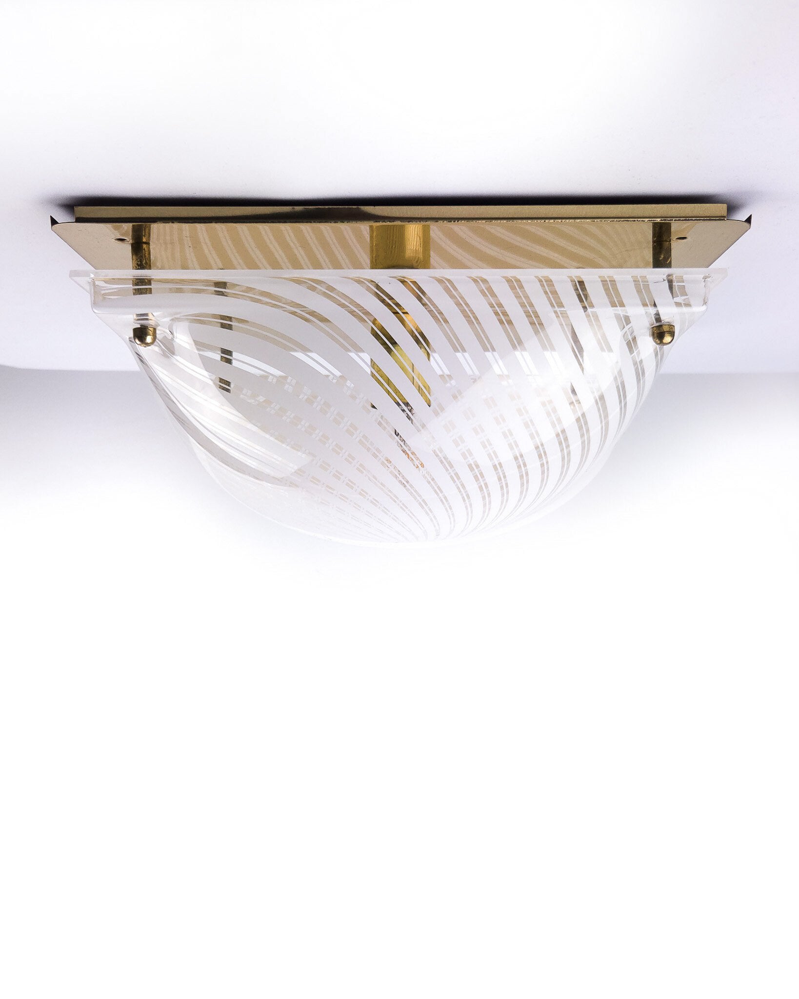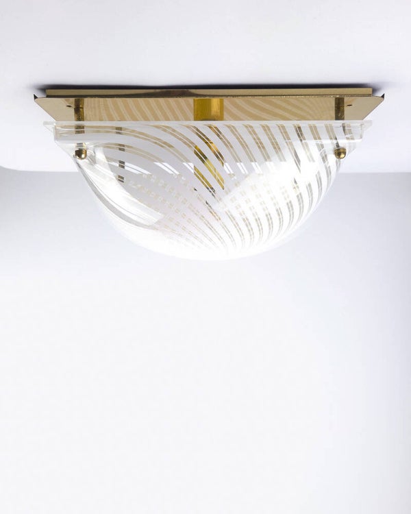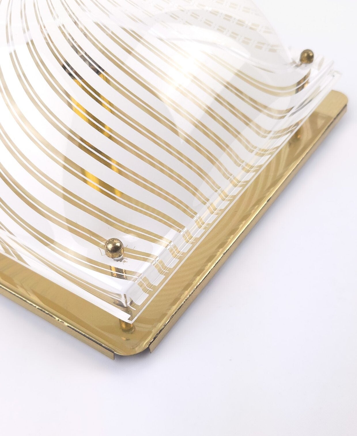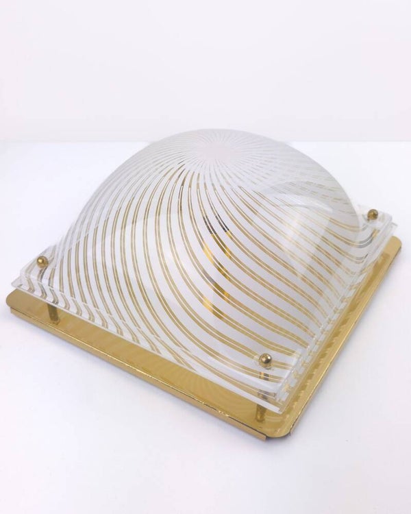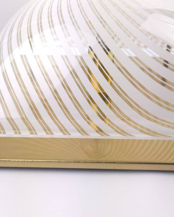 Deze vintage plafondlamp uit de jaren 70/80 heeft een bolvormige kap die bevestigd is op een metalen onderplaat. De kap is gemaakt van transparant kunststof, heeft witte strepen en wordt met metalen kogelknopjes op de goudkleurige plaat geschroefd. Het patroon zorgt voor een opvallend schaduwspel. Deze vintage lamp is hoogstwaarschijnlijk geproduceerd door Massive (merksticker ontbreekt).