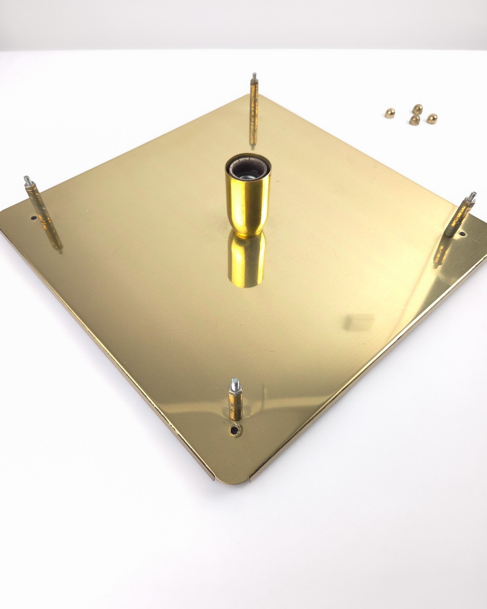 Deze vintage plafondkap is in mooie vintage staat. Minimale gebruikssporen op de plaat, met name aan de randen en enkele krasjes op de hoeken van de kap waar de knopjes vastgedraaid worden. De kap is in het midden heel licht gedeukt.