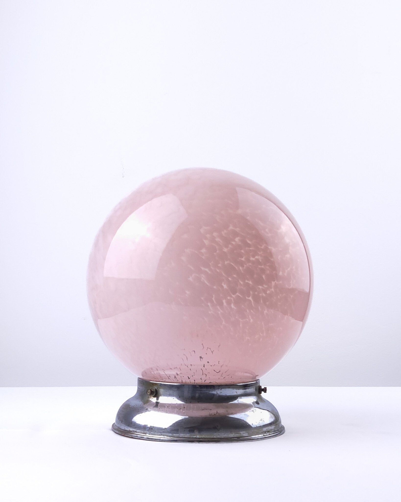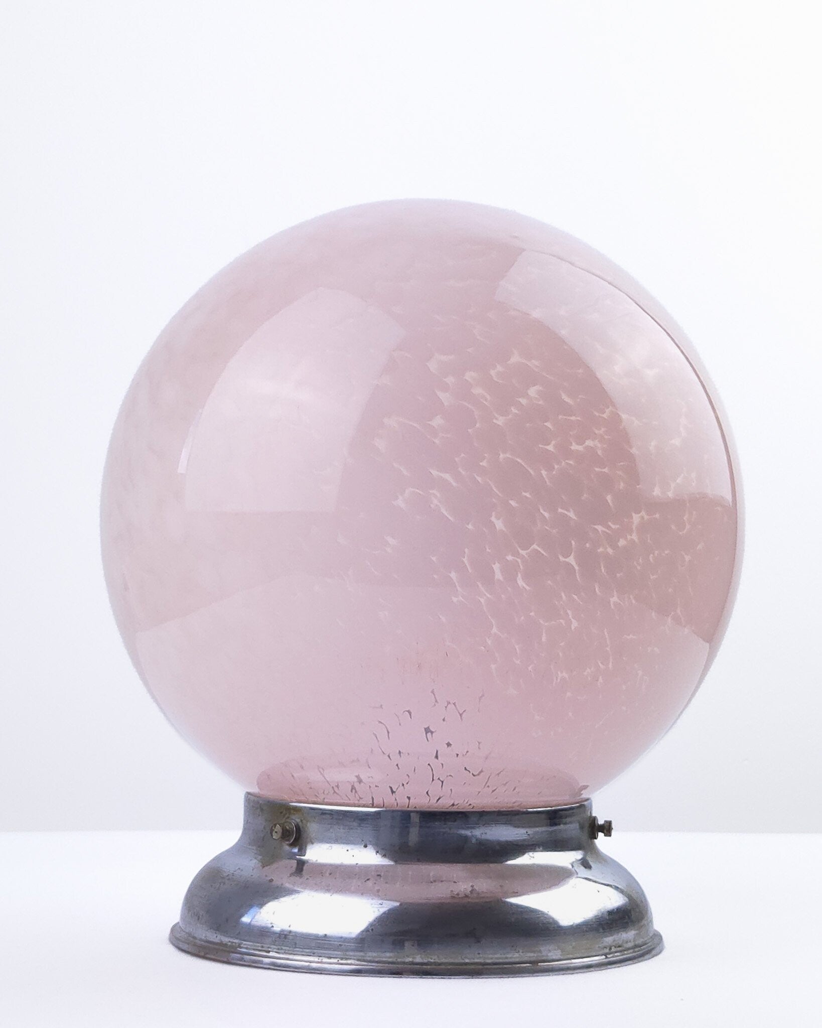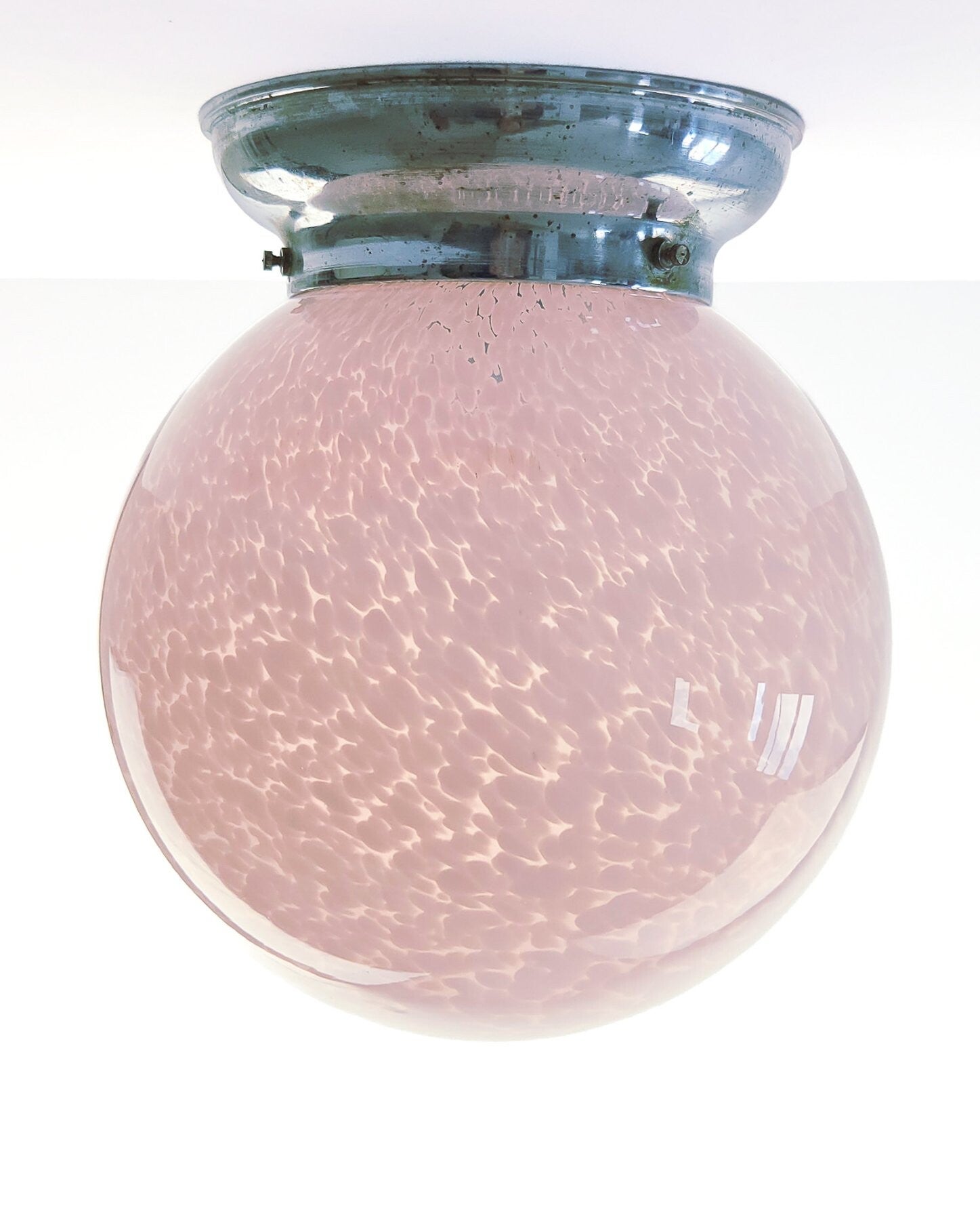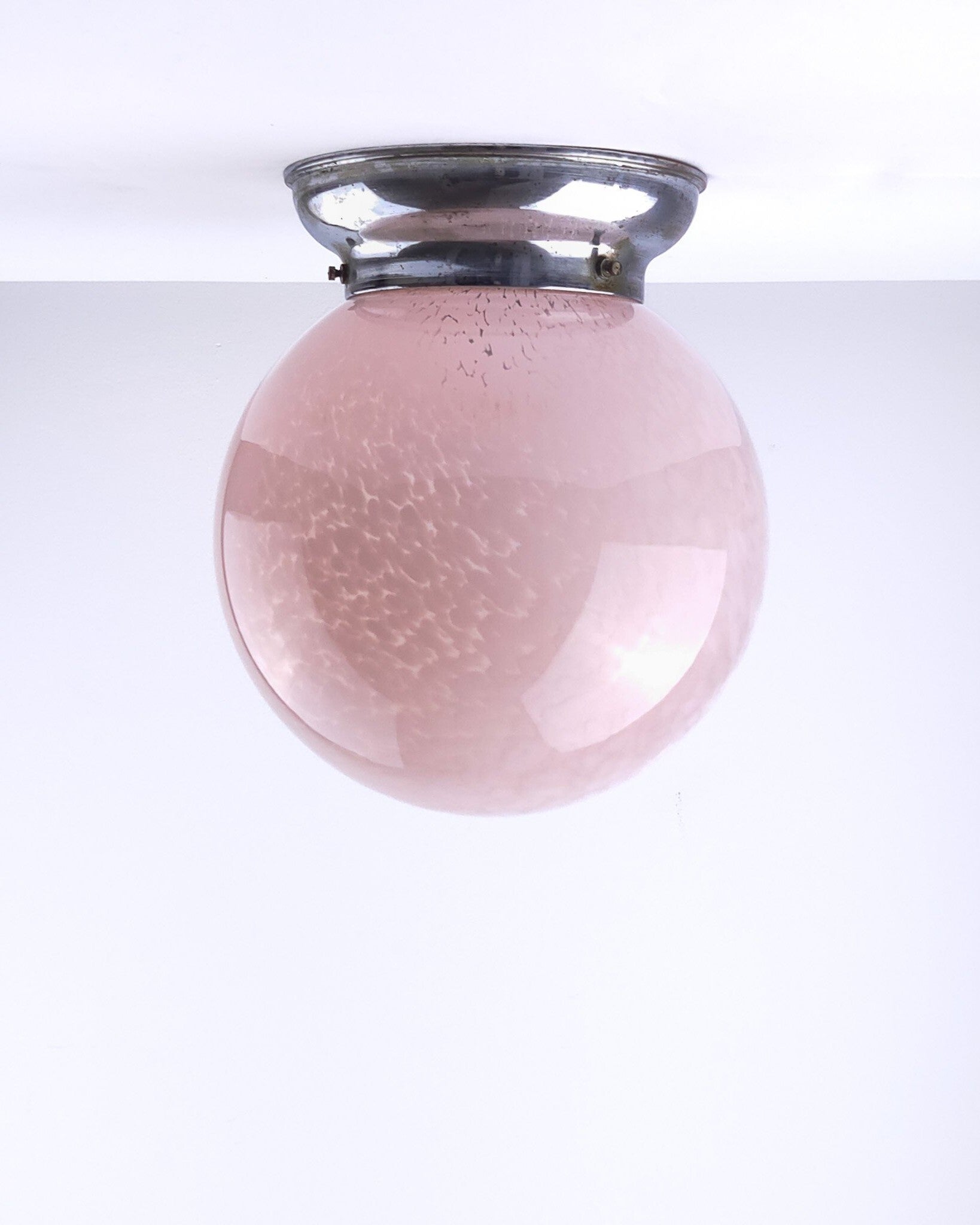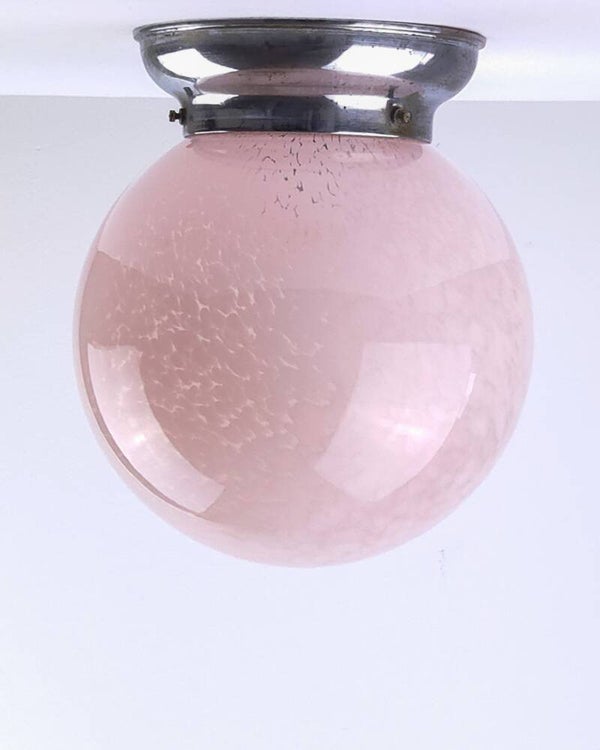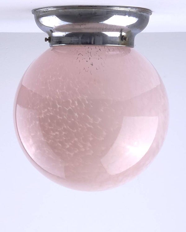 Zeer mooie Art Deco plafondlamp vermoedelijk van Franse komaf. De glazen bol heeft een gewolkt patroon en een zacht roze kleur. De roze tint en het organische patroon in het glas zijn kenmerkend voor de late Art Deco periode en komen veel voor in Franse verlichting uit die tijd. De kap is bevestigd op een verchroomd armatuur.