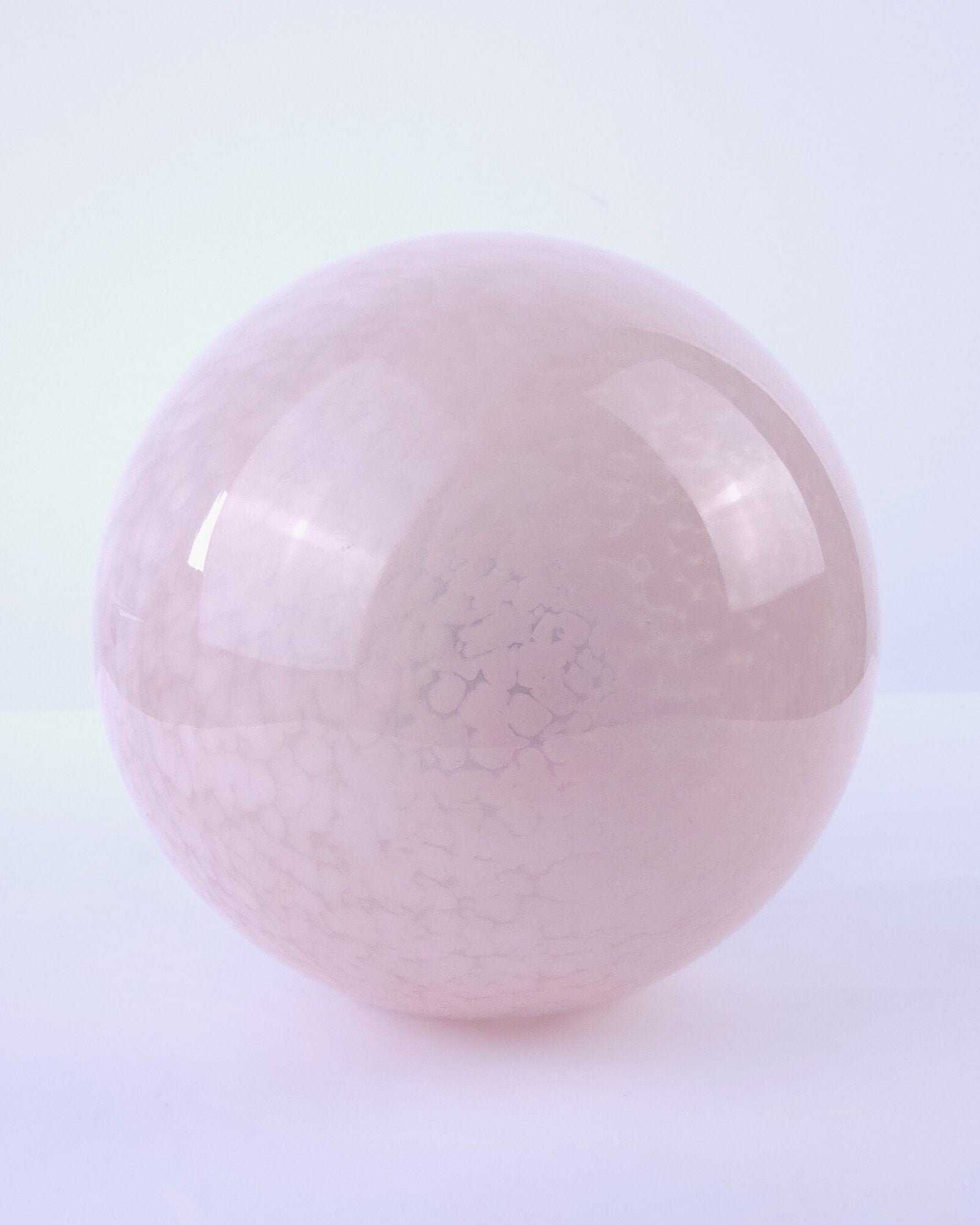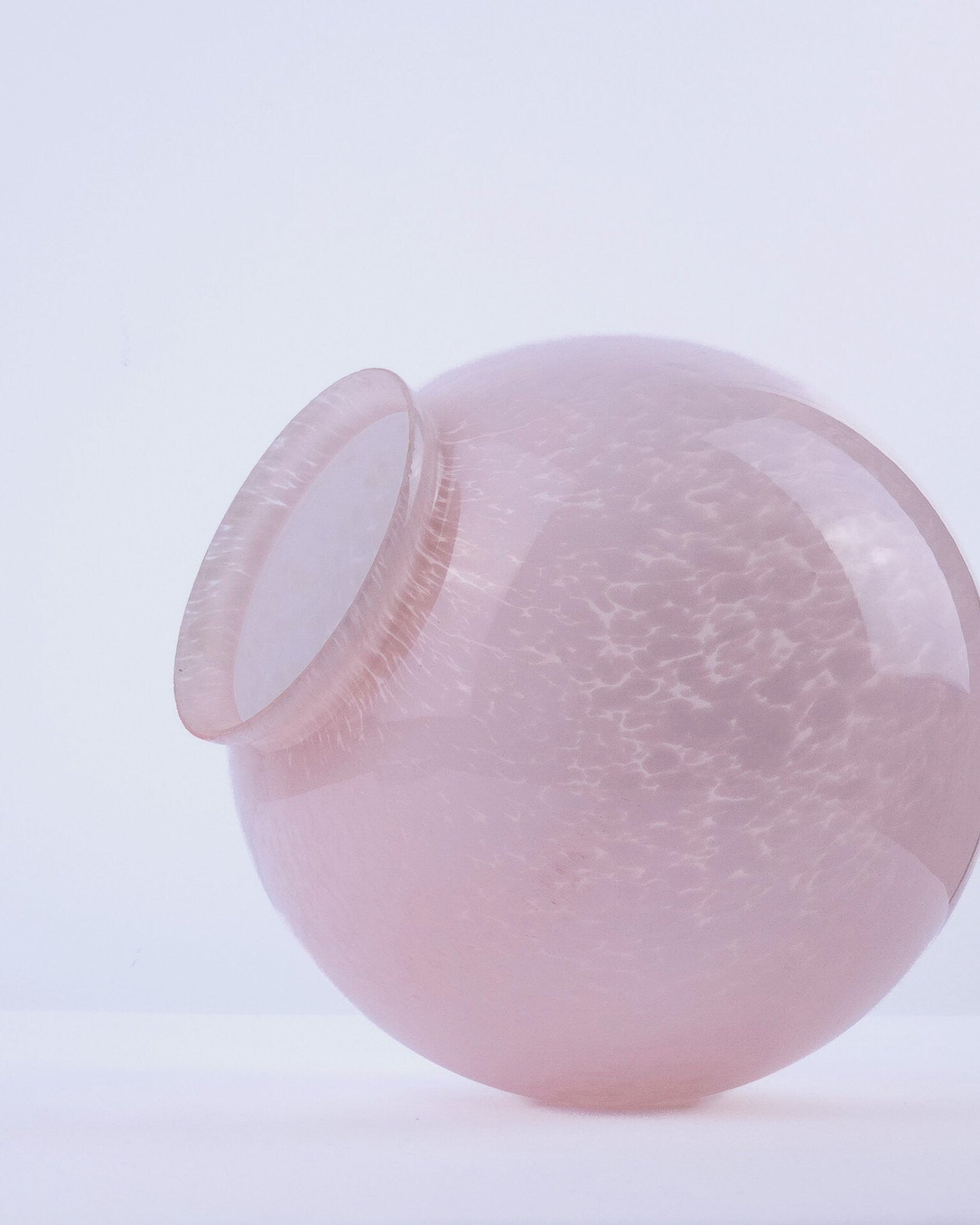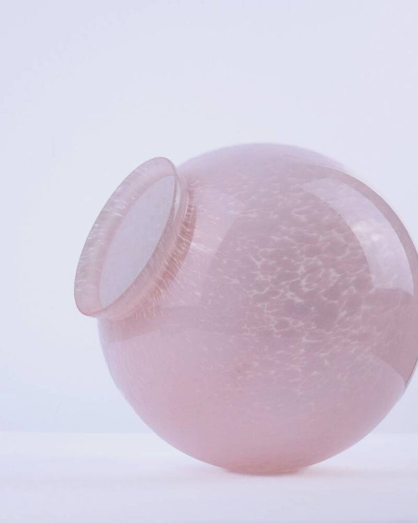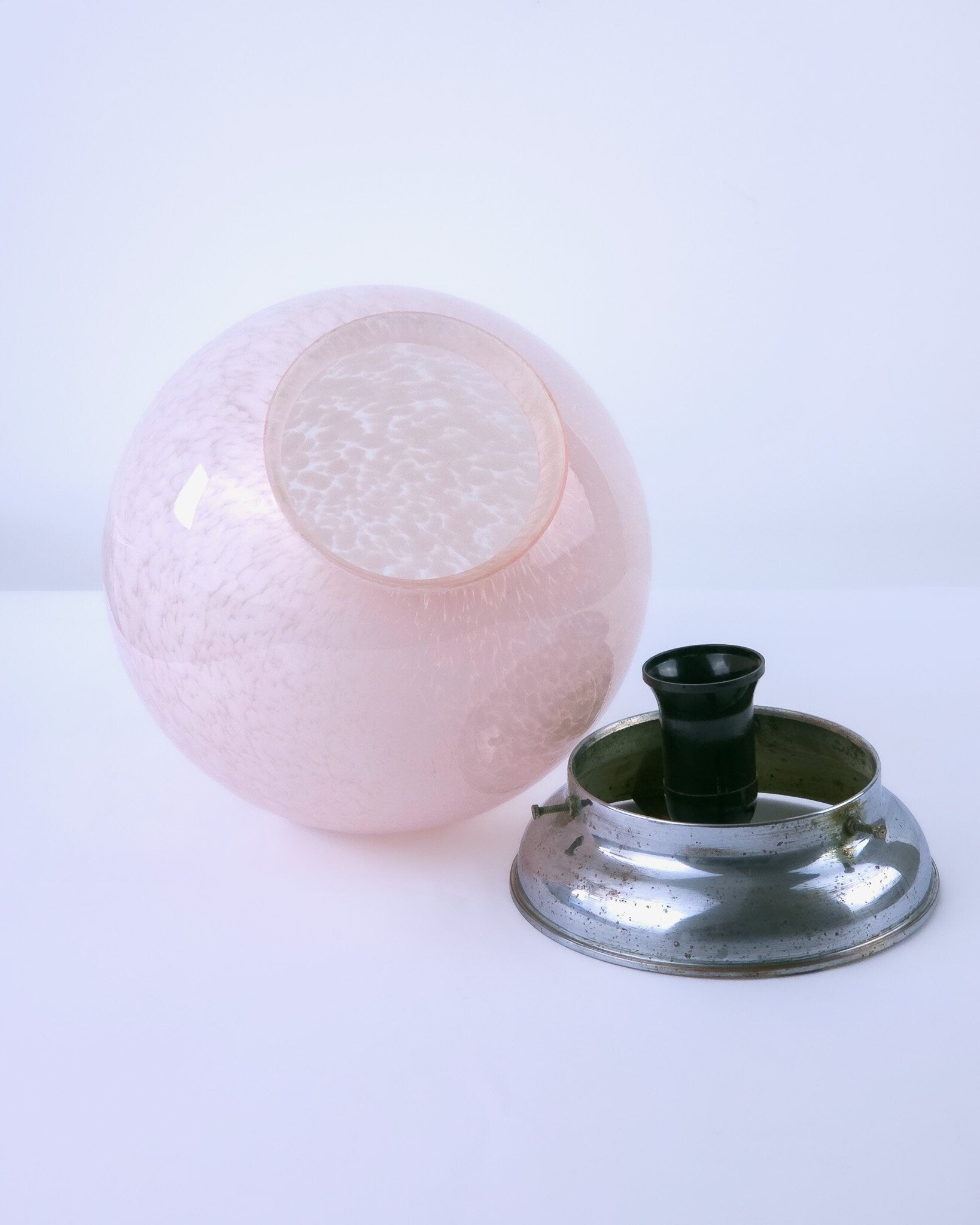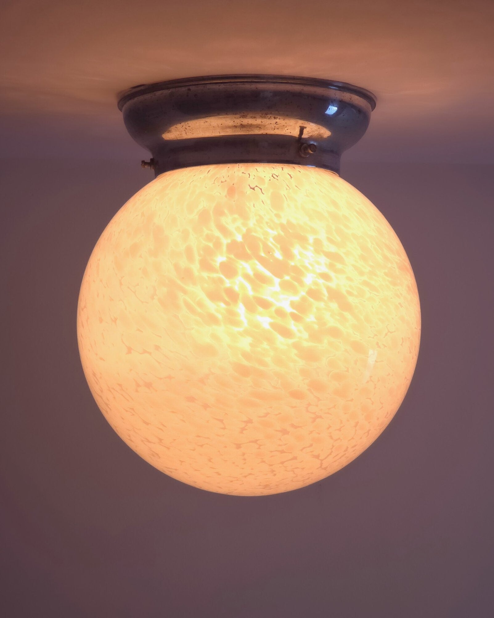 Zeer mooie Art Deco plafondlamp vermoedelijk van Franse komaf. De glazen bol heeft een gewolkt patroon en een zacht roze kleur. De roze tint en het organische patroon in het glas zijn kenmerkend voor de late Art Deco periode en komen veel voor in Franse verlichting uit die tijd. De kap is bevestigd op een verchroomd armatuur.