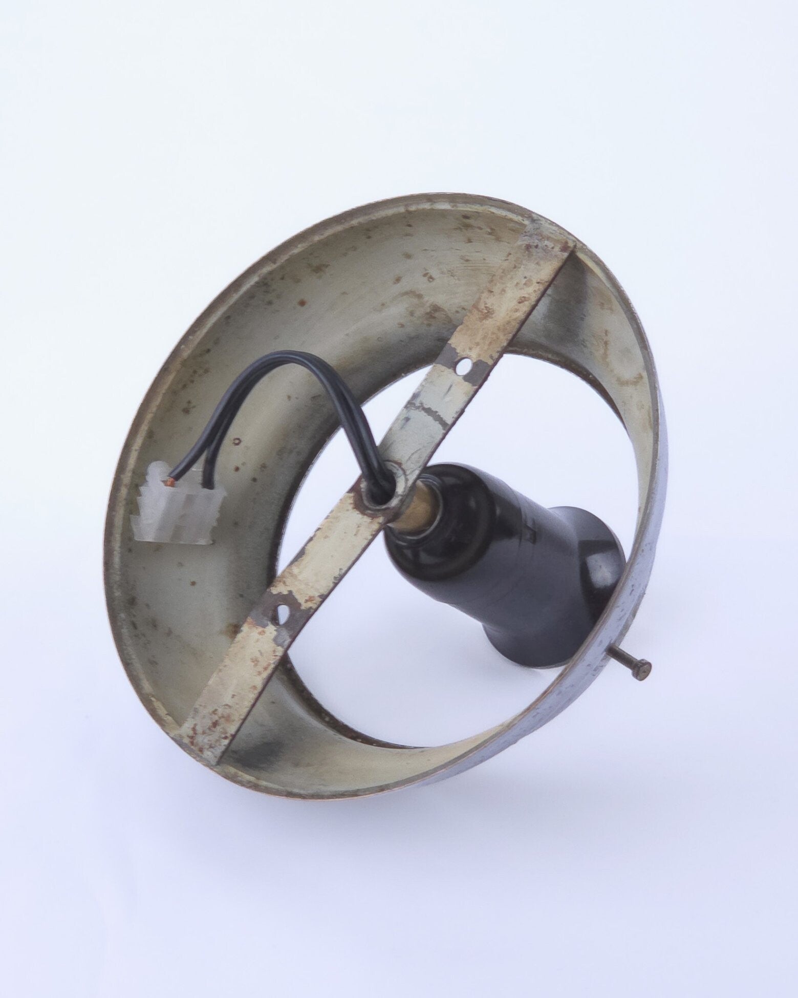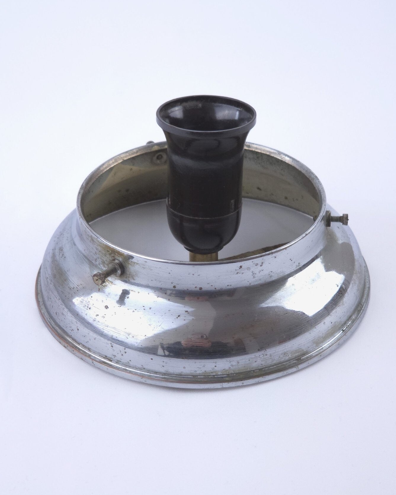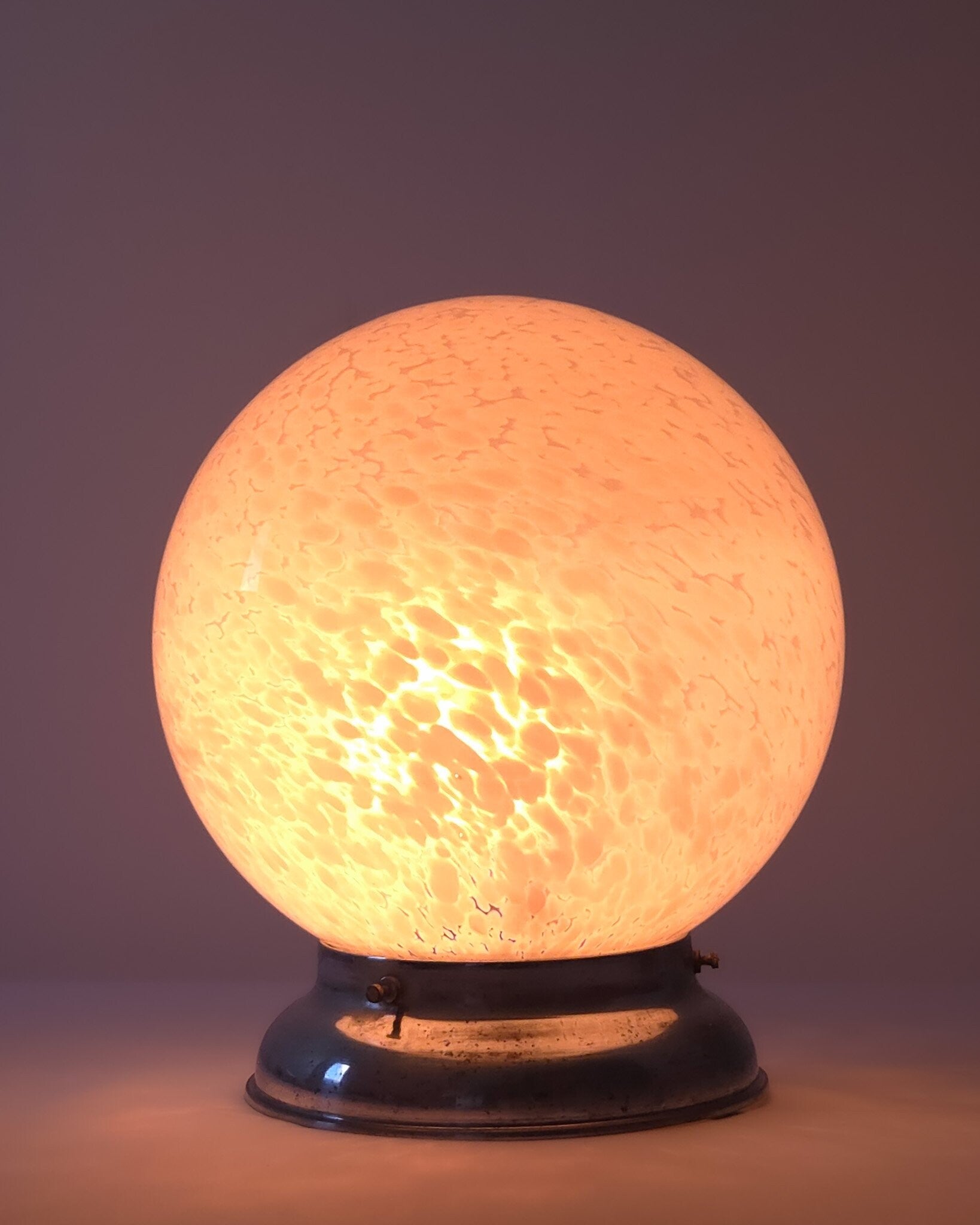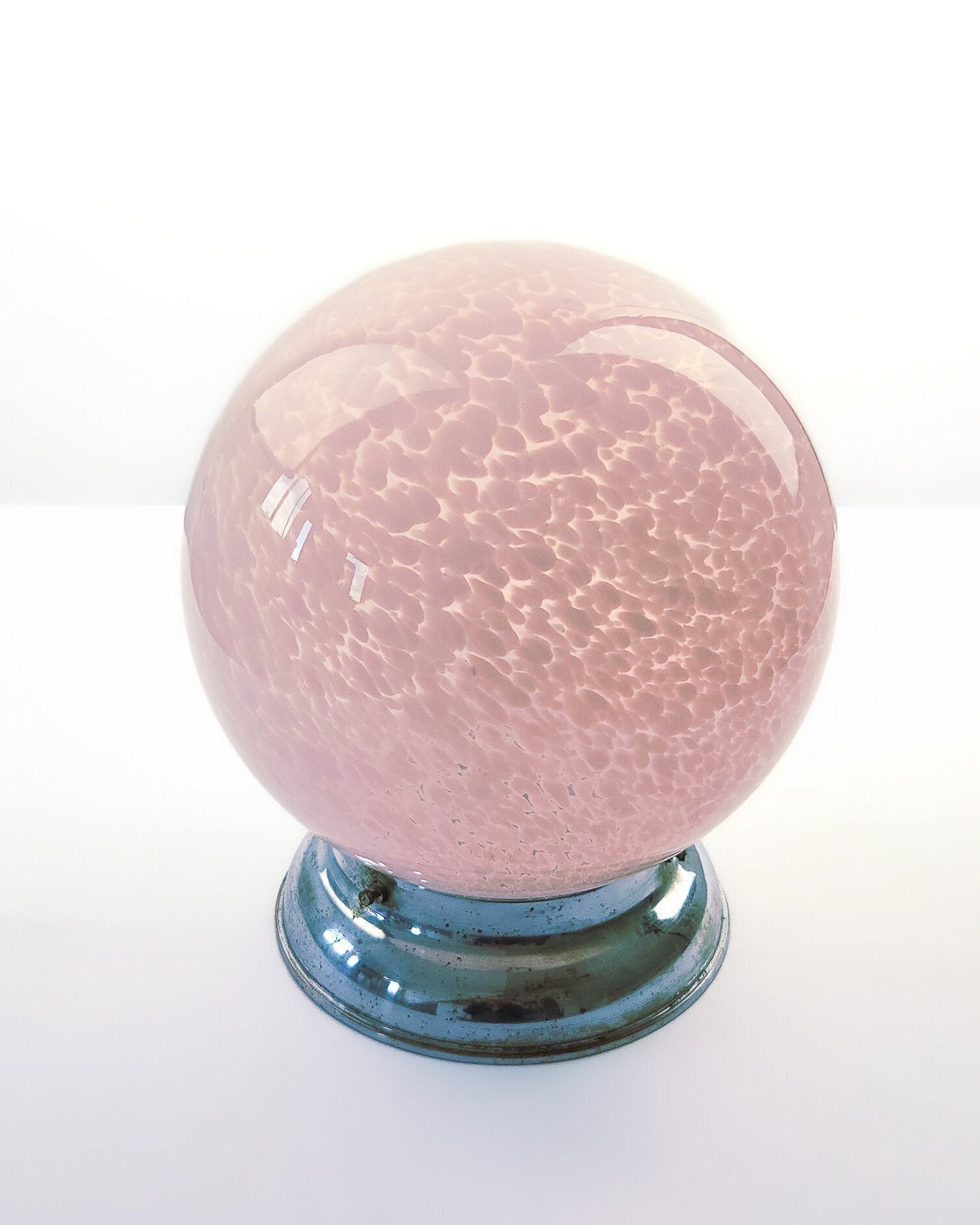 De glazen bol is gaaf. Het chroom heeft diverse oxidatie plekjes conform leeftijd.