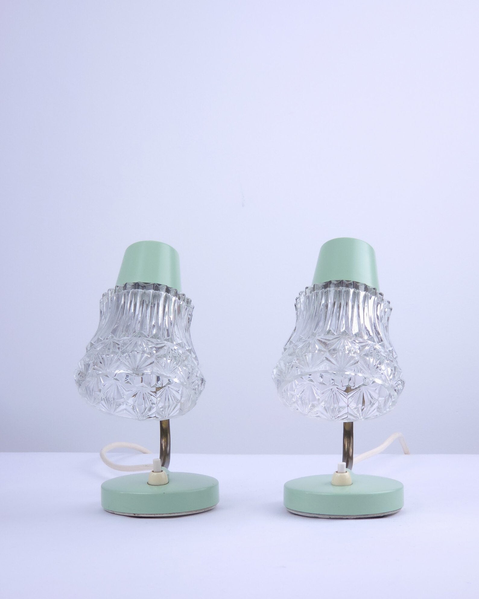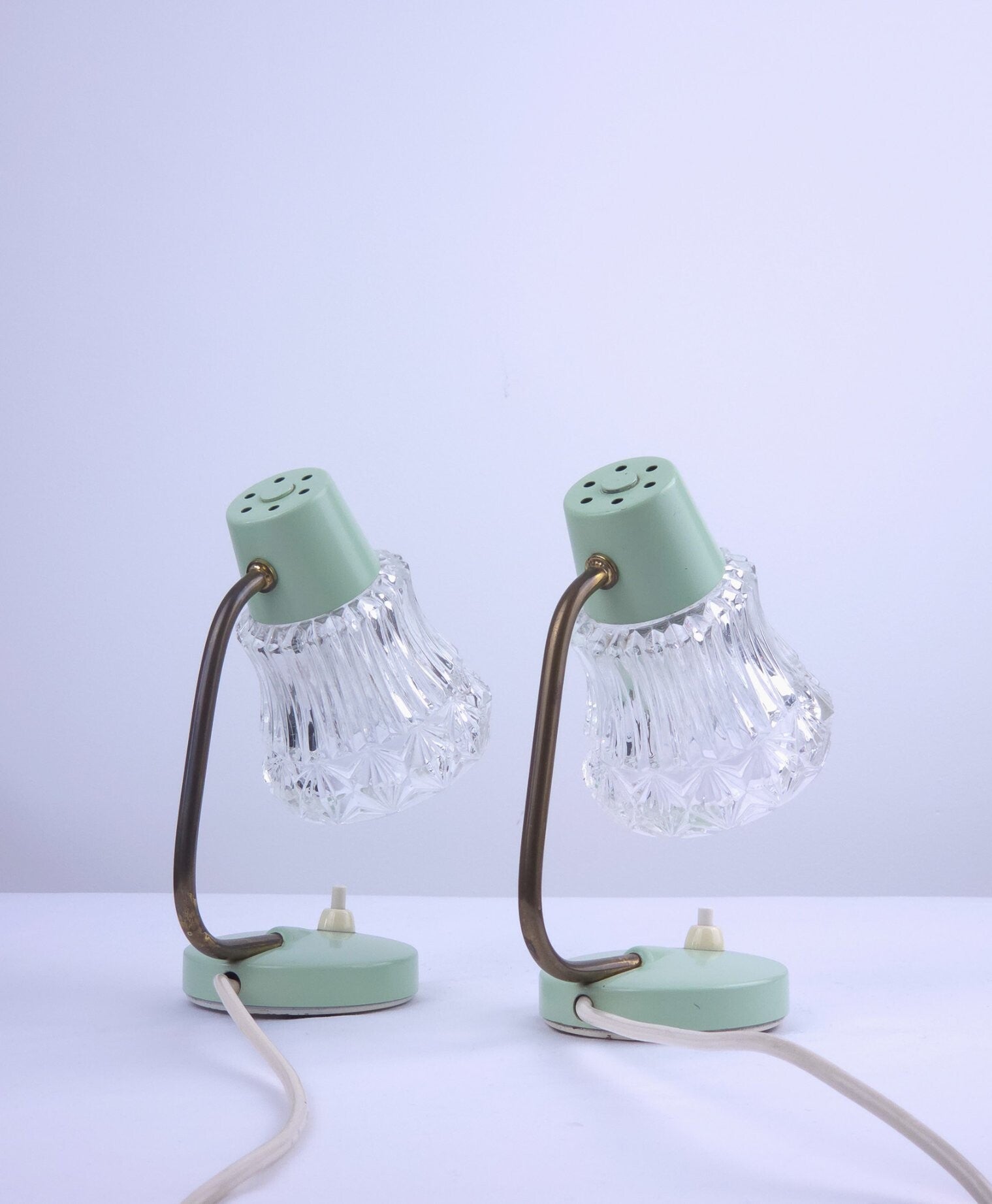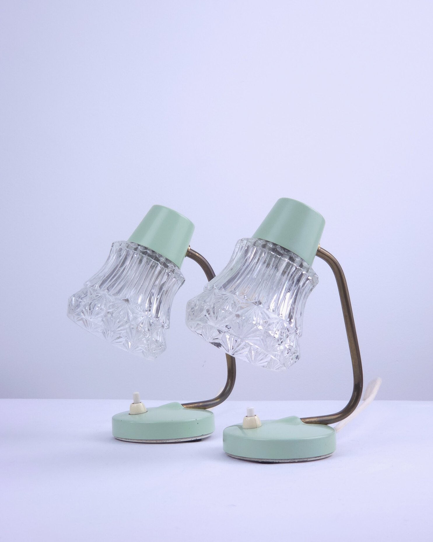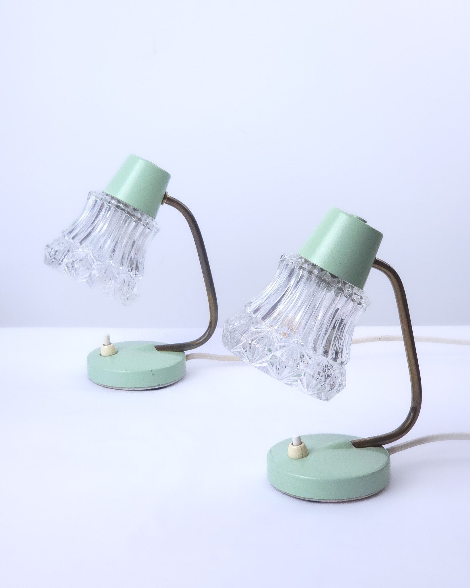 Deze twee charmante vintage tafellampjes ademen de sfeer van de jaren 50 en hebben een typische West-Duitse uitstraling. De lampjes hebben een mintgroene metalen voet, een messing gebogen arm en een transparante glazen kap. De combinatie van mintgroen, messing en glas maken deze lampjes heel charmant. Dankzij het compacte formaat zijn ze goed als bedlampje te gebruiken. Lichtknopje op de voet.