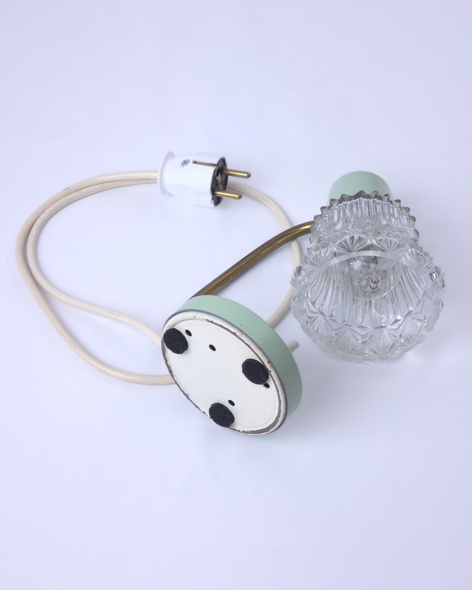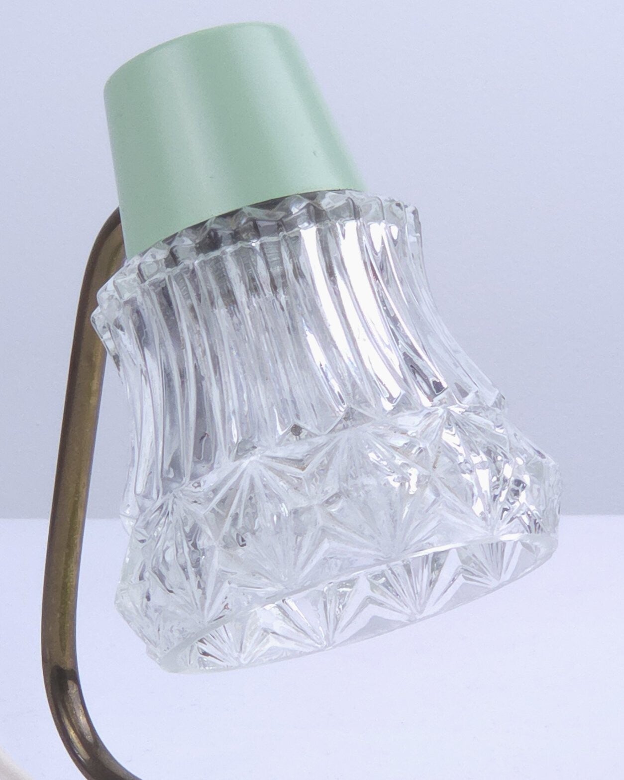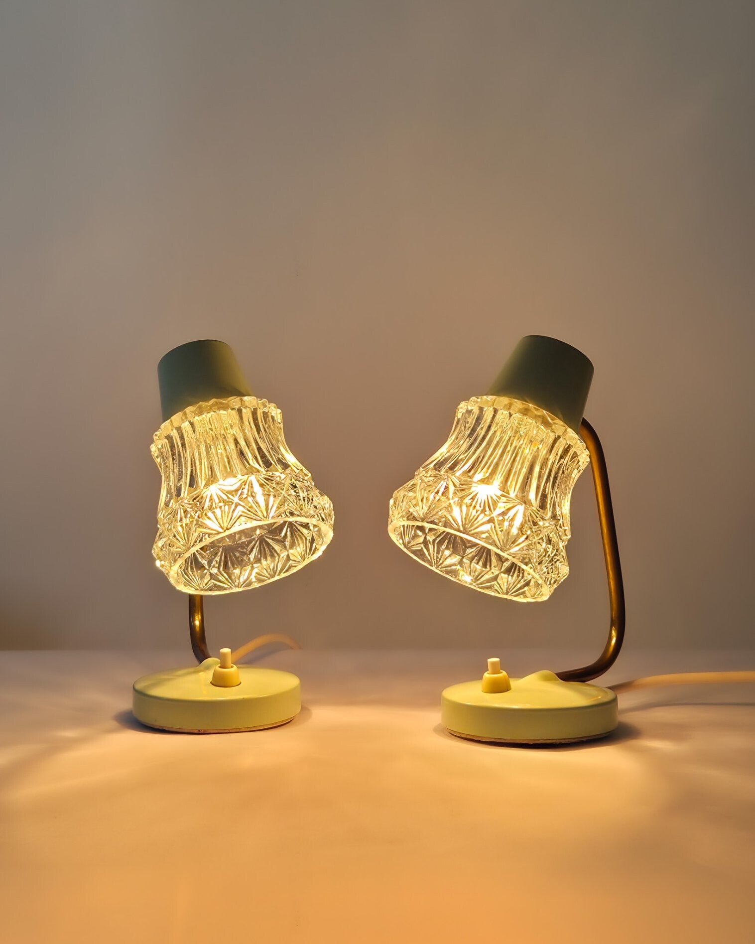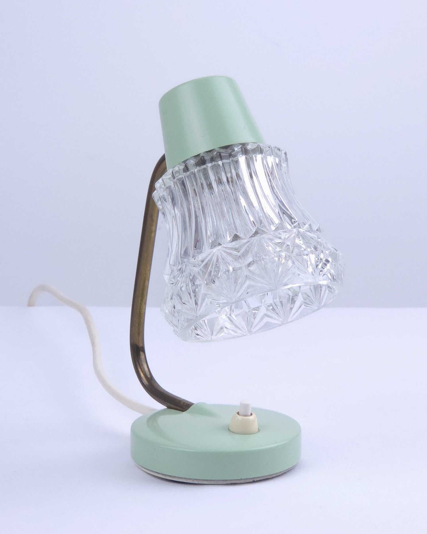 Deze twee charmante vintage tafellampjes ademen de sfeer van de jaren 50 en hebben een typische West-Duitse uitstraling. De lampjes hebben een mintgroene metalen voet, een messing gebogen arm en een transparante glazen kap. De combinatie van mintgroen, messing en glas maken deze lampjes heel charmant. Dankzij het compacte formaat zijn ze goed als bedlampje te gebruiken. Lichtknopje op de voet.