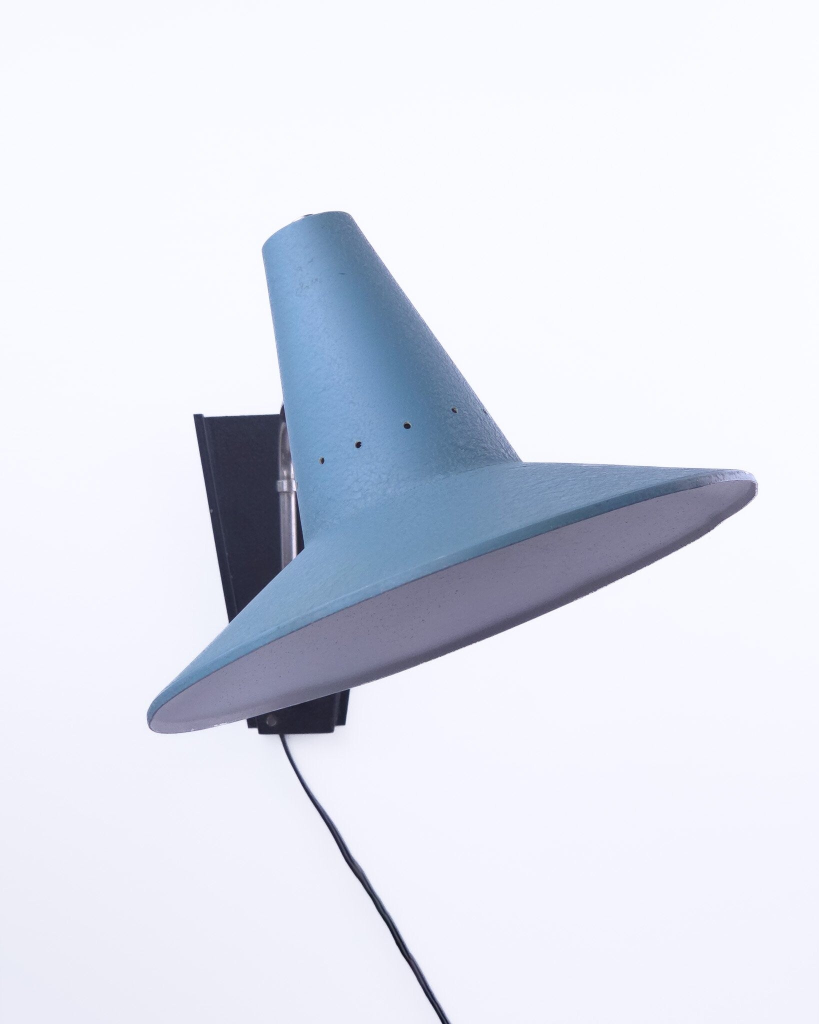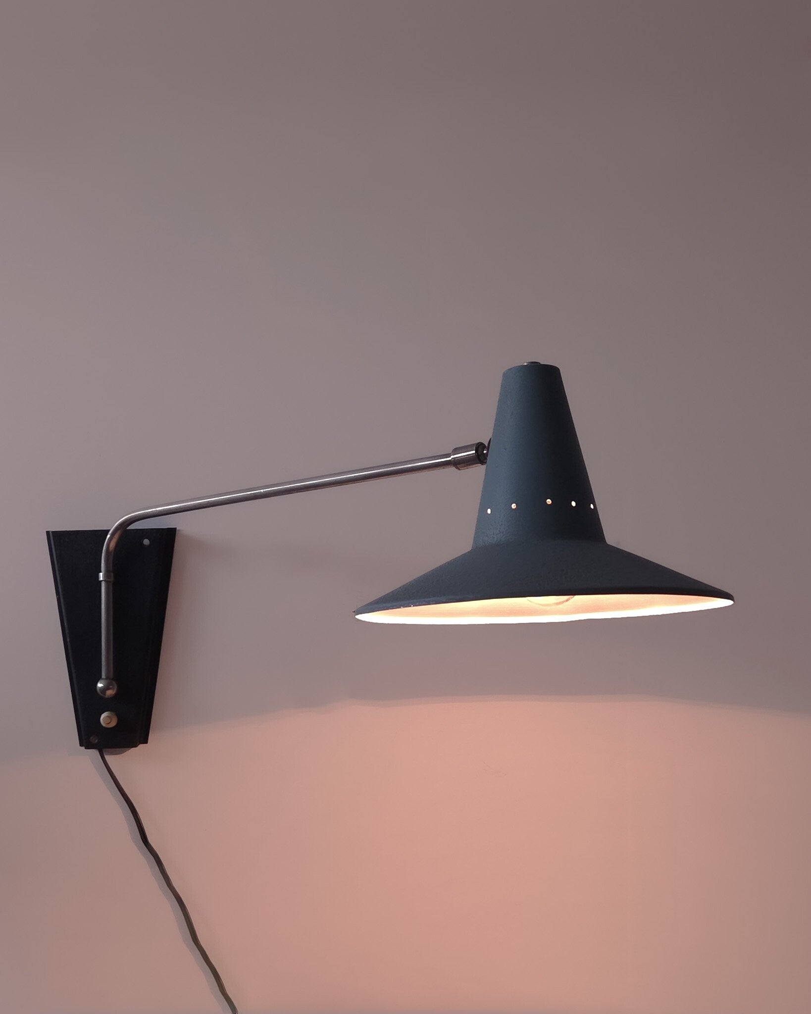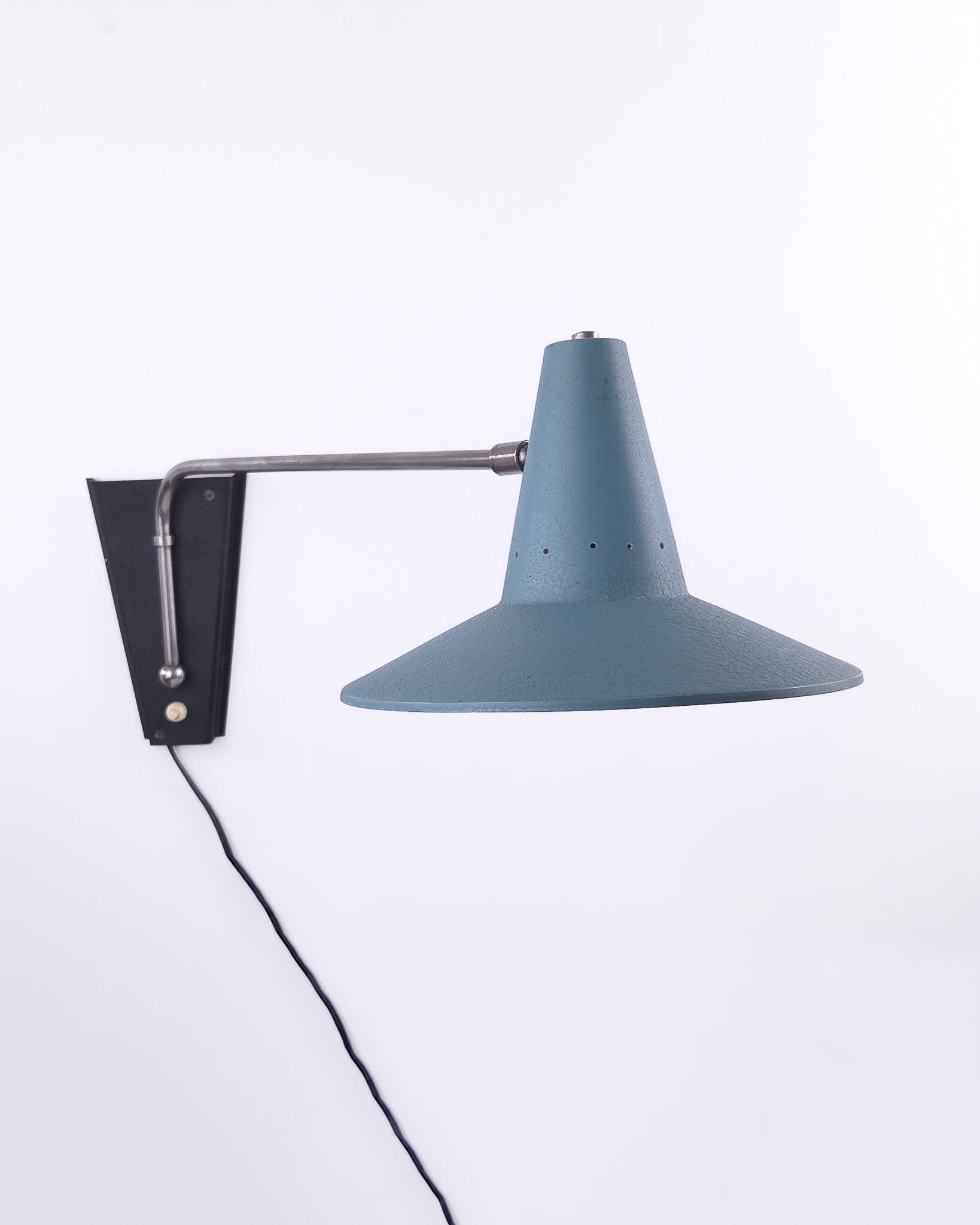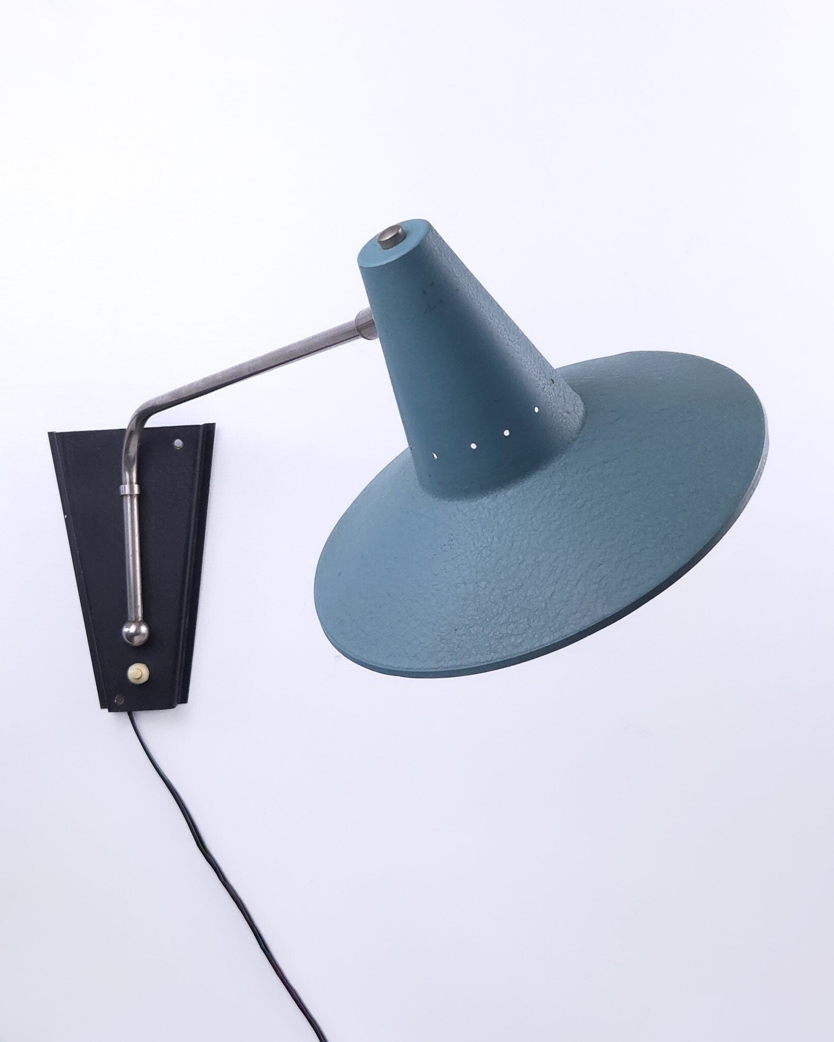 Deze prachtige vintage wandlamp heeft gebruikssporen. De kap is gezien de leeftijd nog in goede staat. Kleine beschadiging aan de rand. Aan de binnenzijde enige verkleuring en de verf laat wat los. Het kogelscharnier heeft een beetje speling. De kap kan hierdoor wel omhoog of omlaag gericht worden, maar blijft in andere posities niet altijd even goed staan. Origineel snoer en stekker.