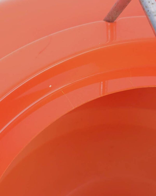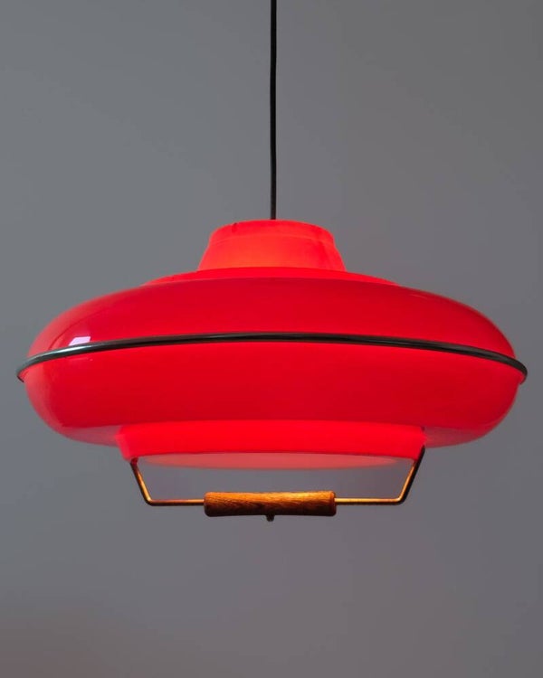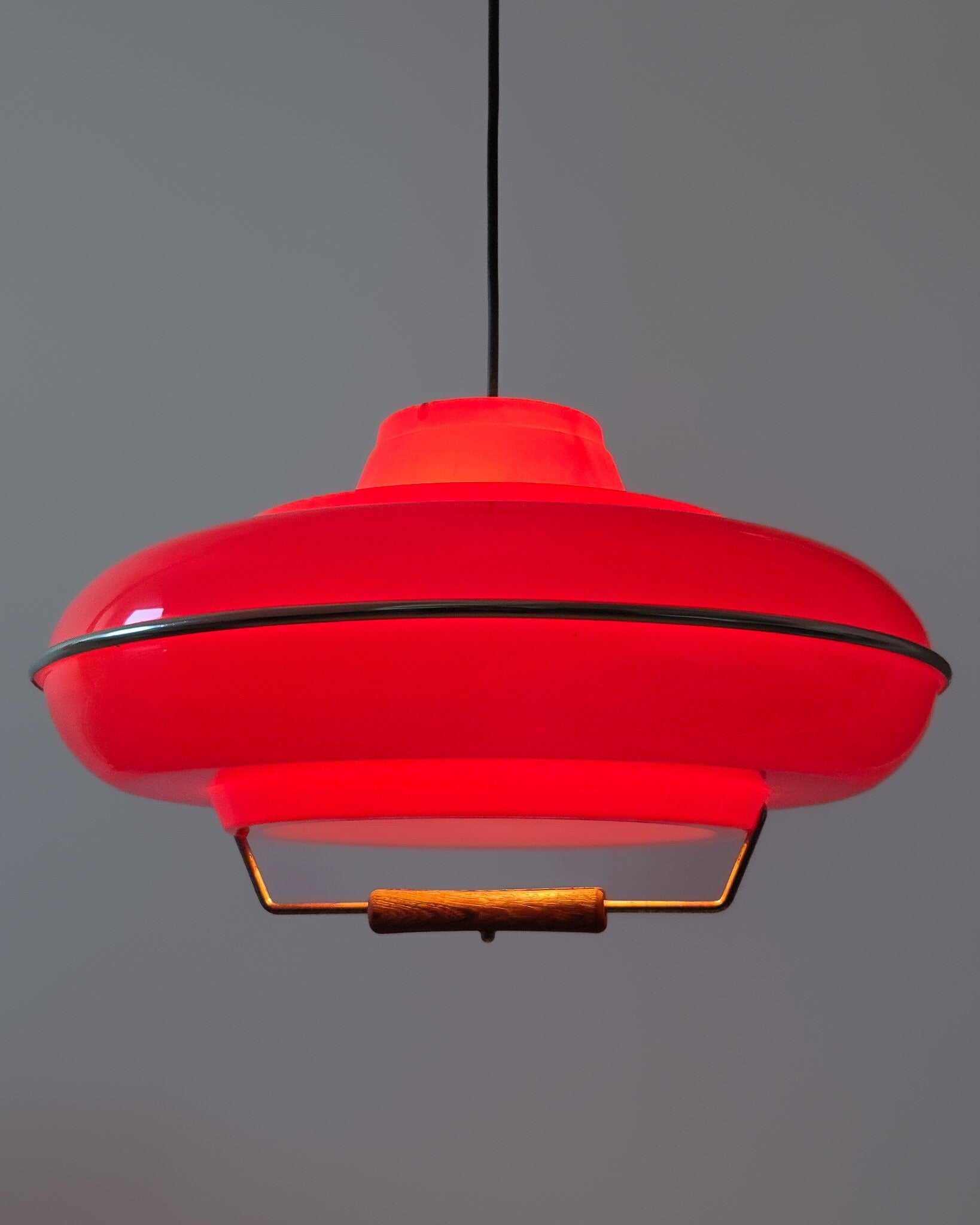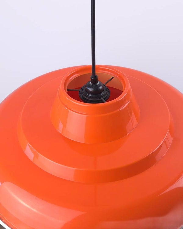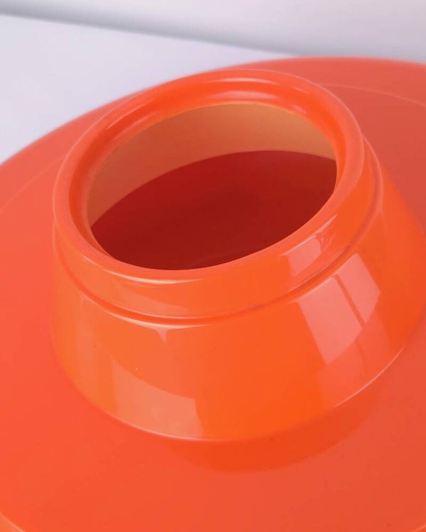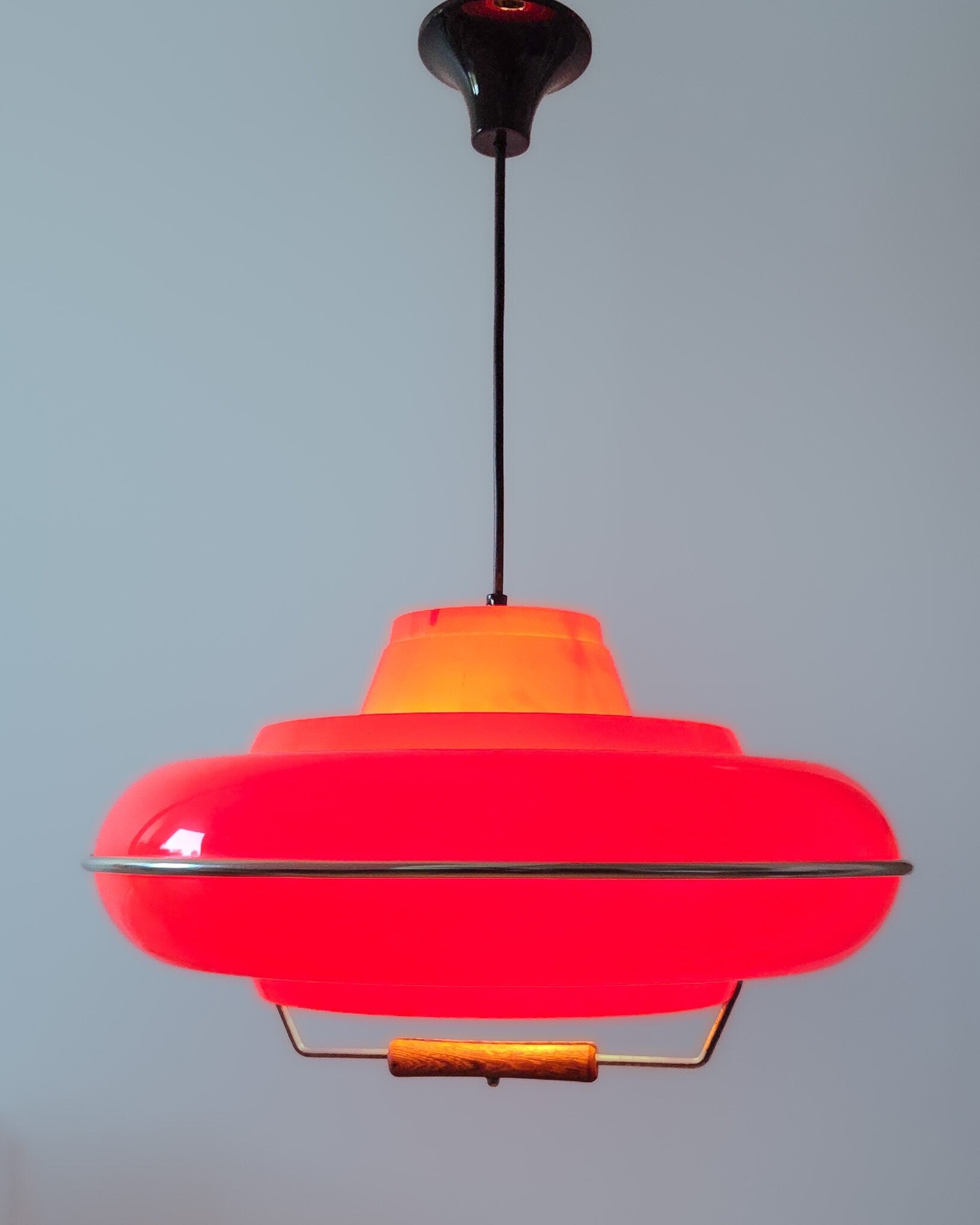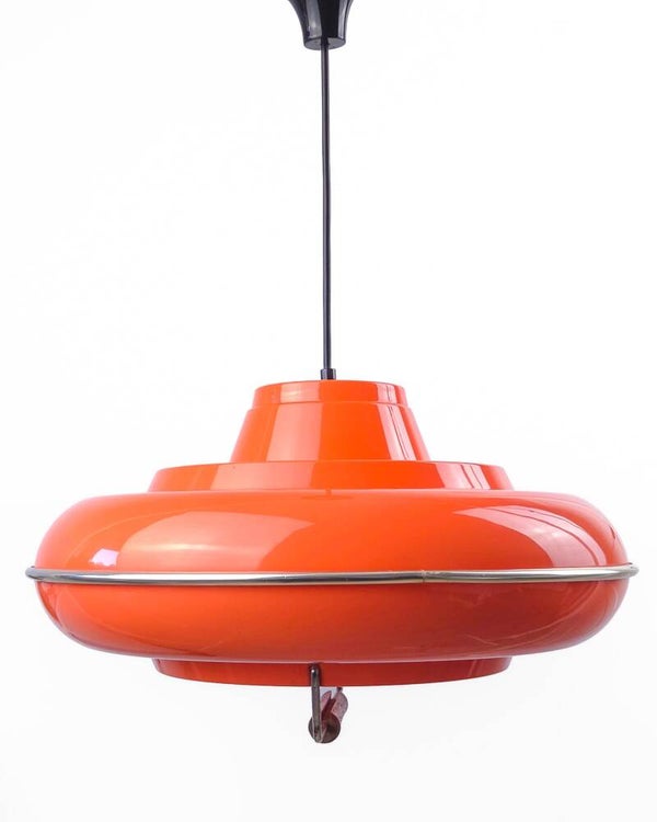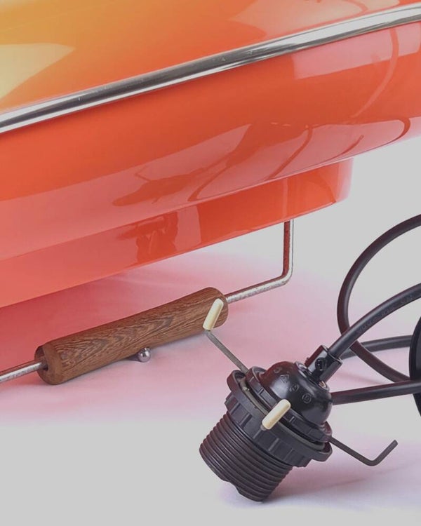 Opvallende vintage hanglamp uit de Space Age periode. Deze UFO hanglamp is gemaakt van kunststof en heeft een fel oranje kleur met een zilverkleurige rand. De hendel is gemaakt van metaal en heeft een houten greep. Het materiaal en de kleur zorgen voor de typische Space Age sfeer als de lamp brandt. Een geweldige eyecatcher!