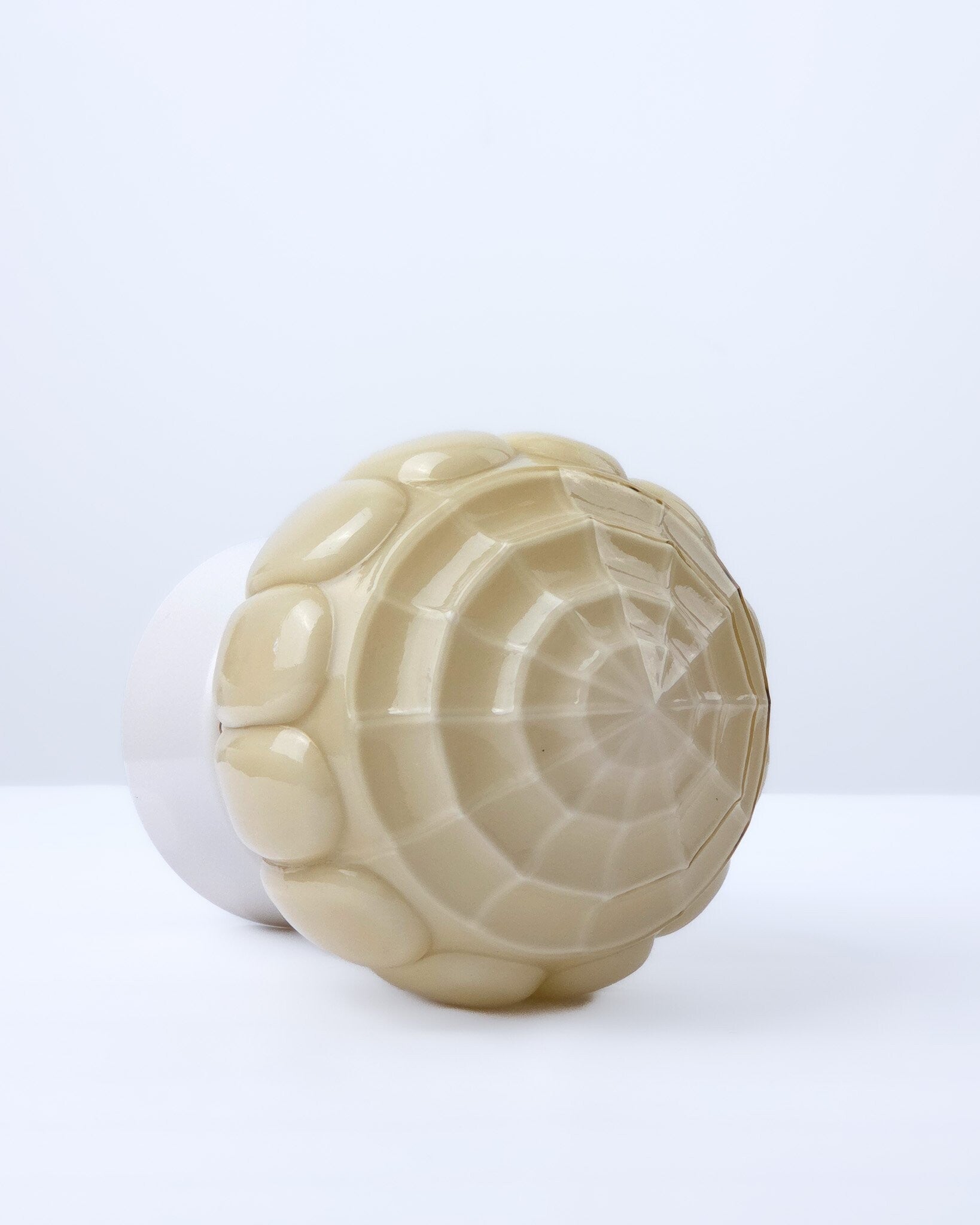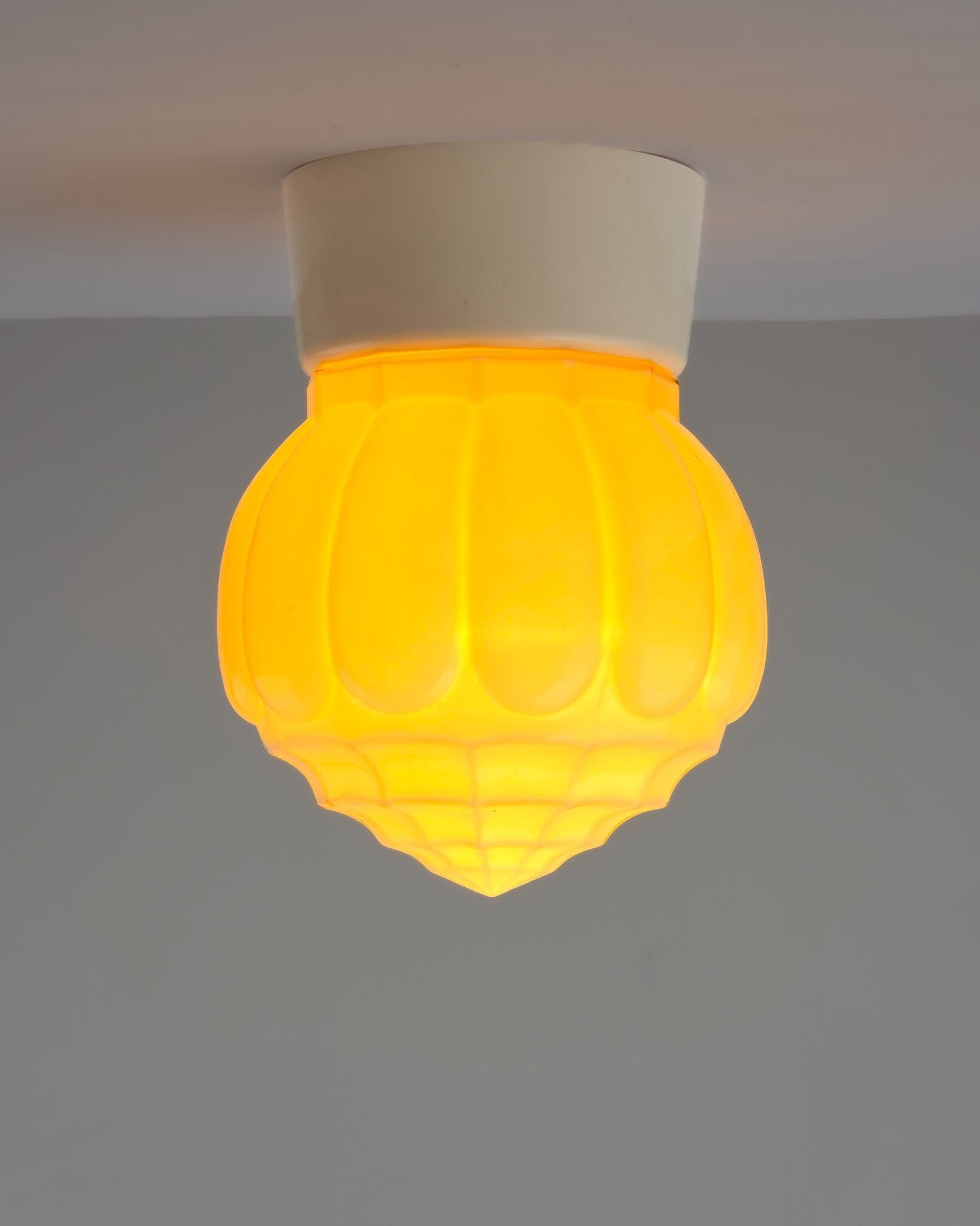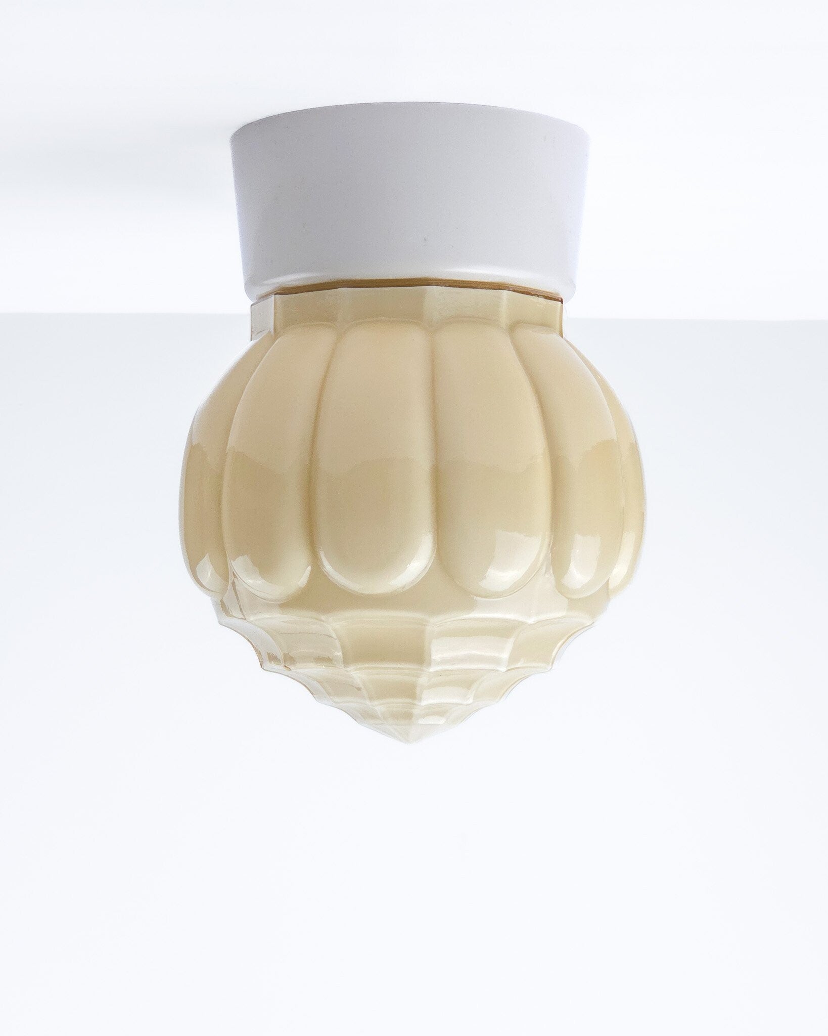 Deze Art Deco plafondlamp, geproduceerd door Thabur, heeft een opalinge glazen kap in mooie beige kleur. Thabur lampen zijn tijdloos vanwege de bijzondere glazen kappen met structuur en vaak in zachte (pastel)kleuren. Ook deze kap is prachtig vormgegeven en loopt geleidelijk toe naar een punt. De kap is bevestigd op een crèmekleurige bakelieten armatuur. Deze lamp kan ook als wandlamp gebruikt worden.